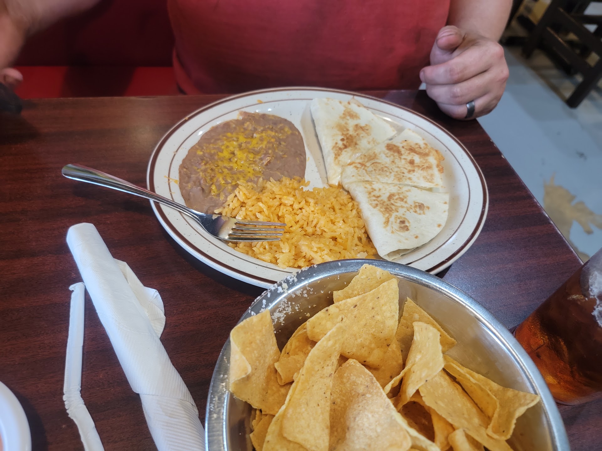 Read moreOverall the restaurant is pretty clean and not overly decorated, it's simple and clean. The waitress is very nice and friendly and apologetic for the delays although I don't know why there were delays because when we got there most people were getting ready to leave. It took a while to get the chips and salsa and our drinks, but the chips and white cheese sauce was delicious. The food was tasty and the portions not very big but it was fillling nonetheless. Said on their menu that "due to increase in beef they're adding 99 cents to each beef item on the menu." I'm not quite sure what that meant so the price was a little more than I figured. Although when we got the bill, we were charged $0.99 extra even though we didn't get any beef items. our bill was actually less than we had anticipated which was nice & We gave an appropriate tip as well when we paid the bill. Overall a nice place to eat.