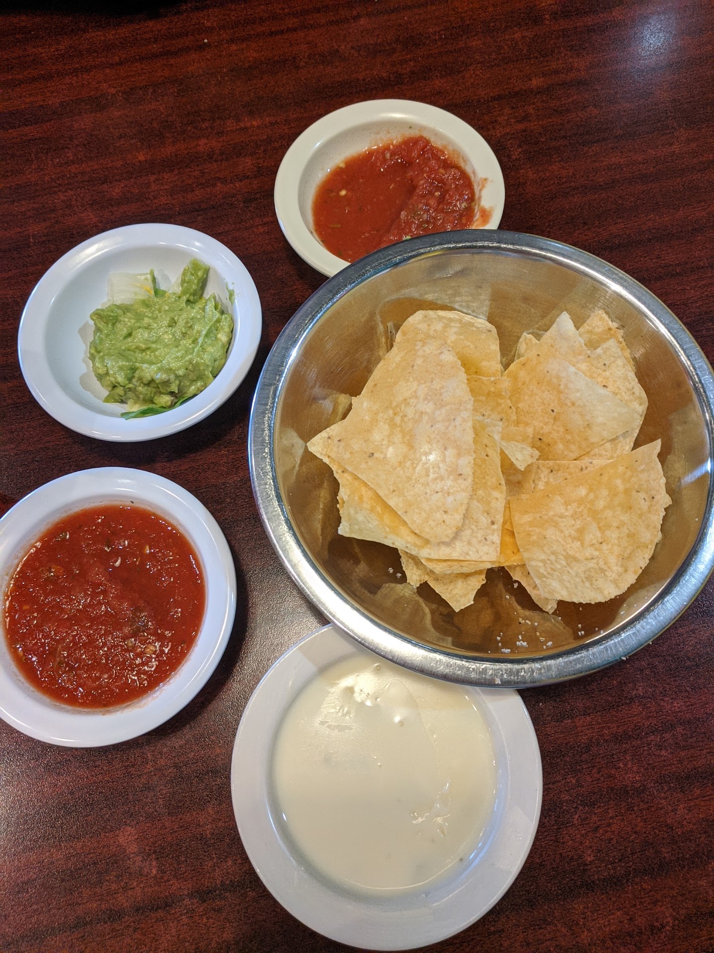 I came here on a Sunday afternoon, which I know can be busy especially with the after church crowd since a lot of other restaurants in town are closed on Sunday. We were greeted at the front and given a 30 minute wait time, so we waited outside. The restaurants decor was good, the chairs were unique and the colors where nice, decently clean. Our waitress was good, very friendly and speed was ok for the occasion. Now where is goes downhill was the food. There seems to be an extra charge to a lot of things on the menu, from ordering kids meals to specific appetizers. To start they gave us chips and salsa, we added the queso as well. The chips were severely oversalted and the dalsa tasted like canned marinara tomatoes with some jalapeño added in. We ordered the kids chicken strips and fries, the #4 tamales, taco and enchilada with rice and beans, the fajitas trio and the #27 chicken and Chiles relleno. You can smell and taste the fried foods are fried together, the chicken smelled like churros, my child didn't notice much though because she doused it in ranch. The fajitas trio had 4 shrimp 3 pieces of steak and chicken and a whole lot of sauce and onion for the lack of protein. The tamale and enchilada lacked much flavornand the taco was soggy when received. The Chiles relleno was ok, but not a traditional preparation of the dish, the chicken was way overdone and soaked in a cheese sauce. All of the dinner plates came out piping hot, but the food was just warm enough like they had microwaved everything. The rice was dry and beans didn't have any flavor. With the fajita trio it only came with tortillas, we had to ask for for guacamole and sour cream add ons. While this is not one of the worst places we have patreoned, it definitely is not one we...