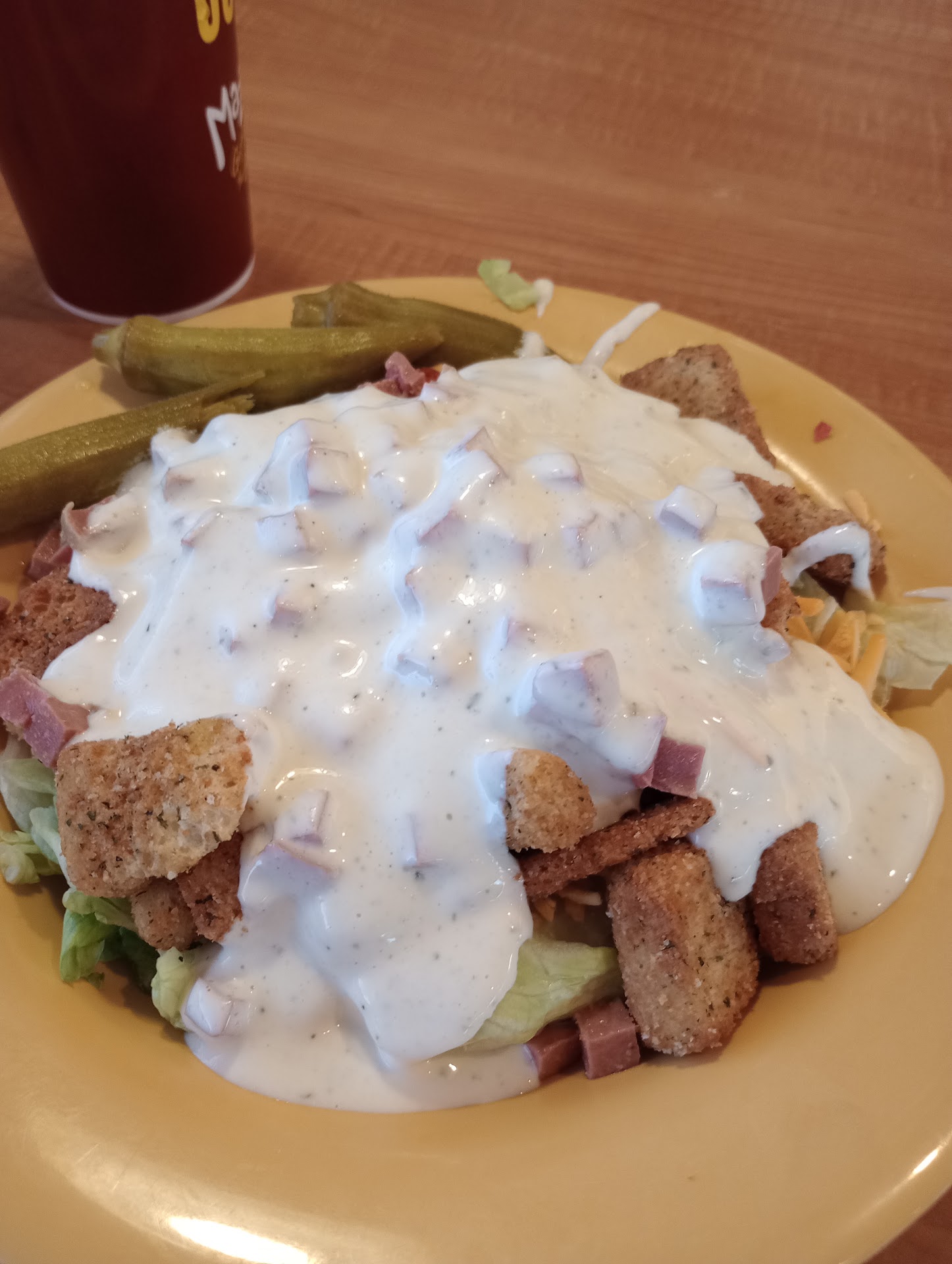 Read moreNever greeted. Finally asked the curly hair girl behind the counter if we order there or at the table. Ordered. Never offered a receipt and when i asked for one, the long hair girl didn’t know how....Dining room was occupied by 2 other tables but there were several dirty tables. Curly hair stood in the door to the kitchen flirting and talking with kitchen staff when she wasn’t on her cell phone that was plugged in charging on the front counter. When the phone rang, they let it ring until one of the 2 let out a disgusted sigh and decided to answer. Kitchen staff seemed efficient but front end is definitely lacking. Gloves on the salad bar for customers to use but curly hair girl never used them when building salads for window orders... PS....order was wrong 🤦🏼♀️ Looks like will find something else while passing...