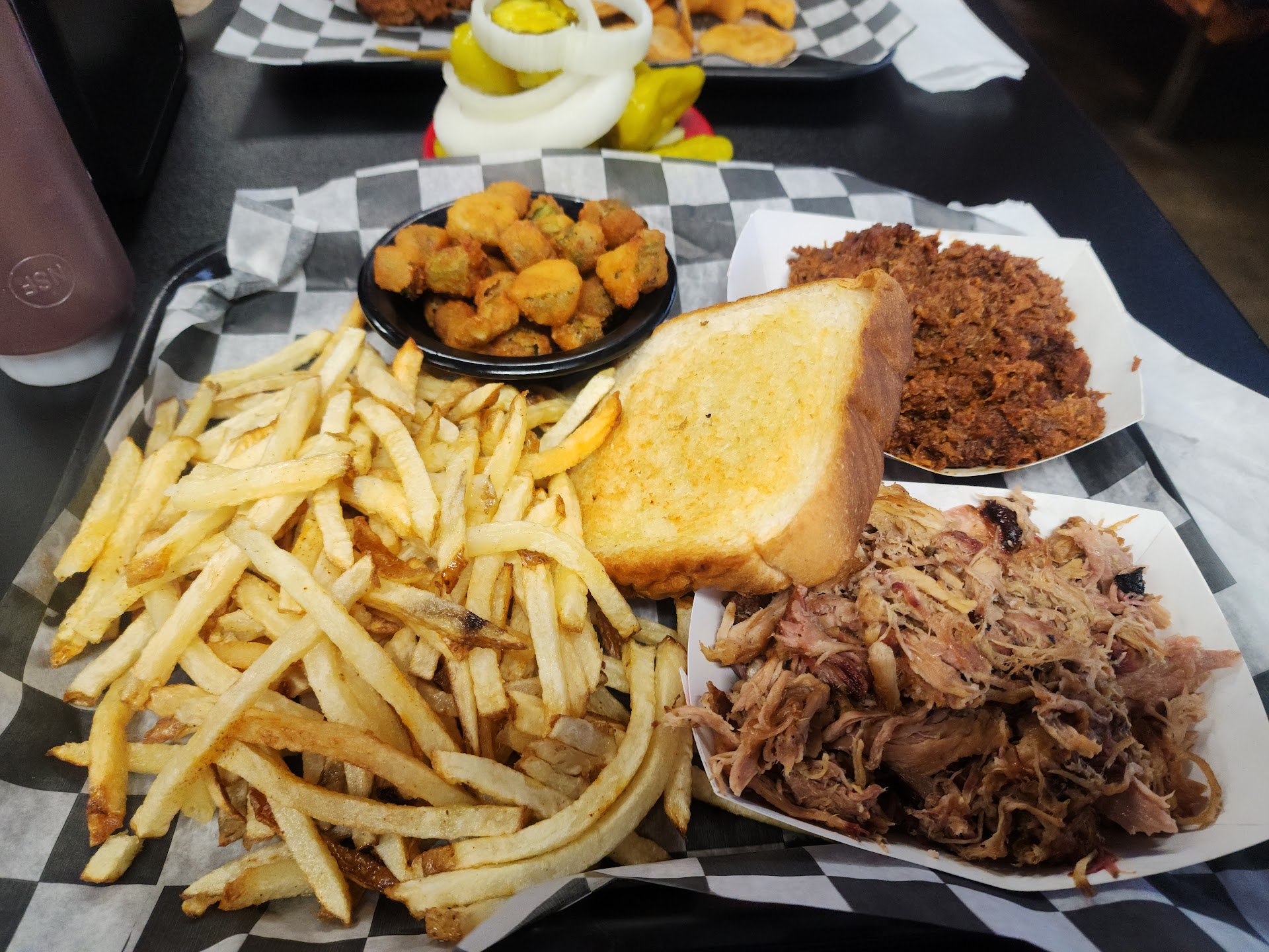 I opted for the two-meat BBQ dinner, which included pulled pork, chopped brisket, hand-cut French fries, fried okra, and Texas toast. The pulled pork stood out as the star of the plate, with excellent flavor and tenderness. However, I found the chopped brisket to be slightly disappointing, as it was a bit greasy and mushy in texture, although the flavor was still enjoyable. The hand-cut fries, despite my usual reservations about them, surprised me with their thin and crispy nature, making them quite tasty.