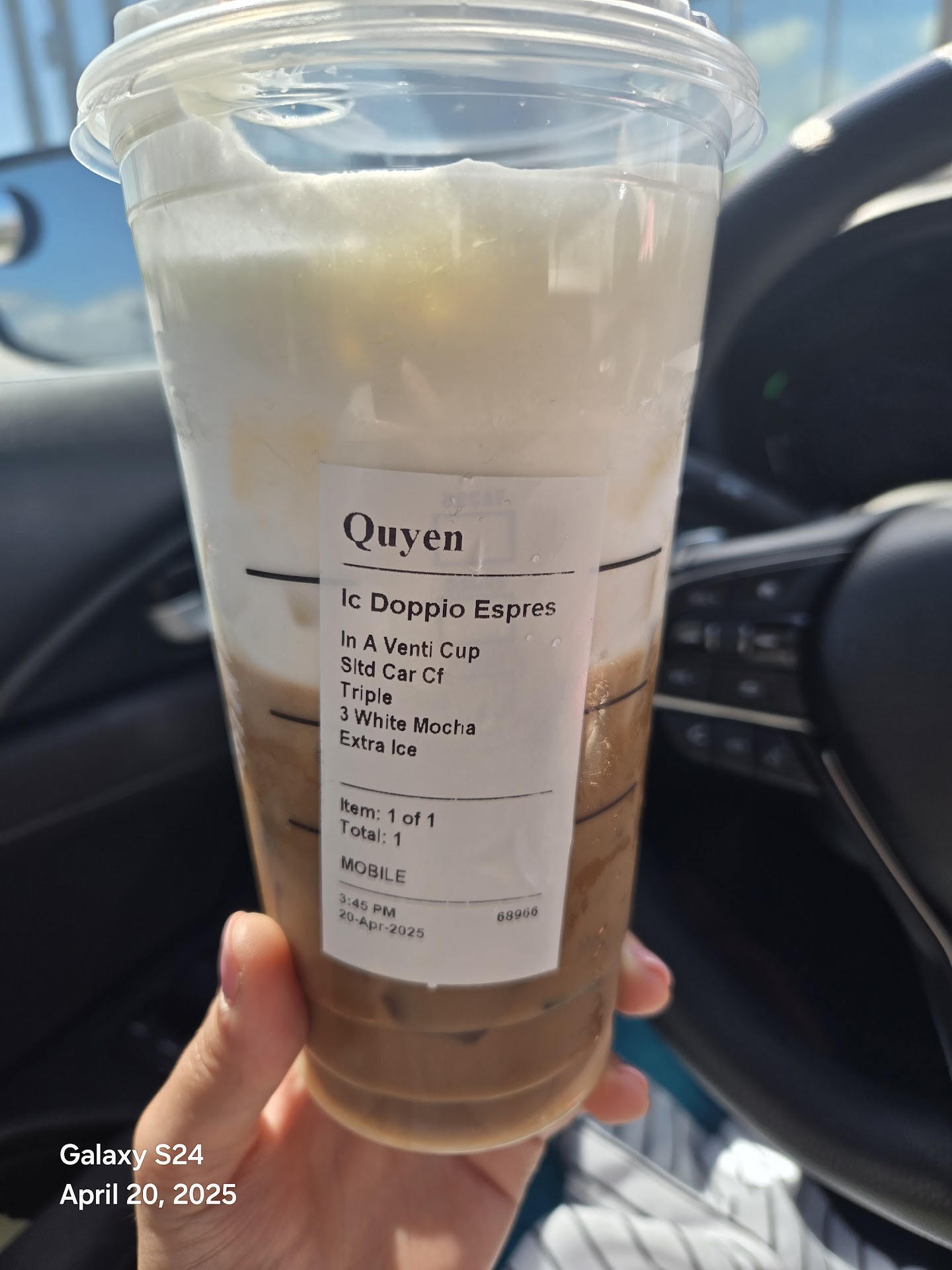 Ā Ā Ā Read moreOrdered on the app - what I always order. My husband was driving so they handed it to him and we pulled off. When he handed it to me I could tell there was VERY little coffee in it. I opened the lid and whipped cream was to the top. I waited for it to melt then took the pic. It was half full, at best.