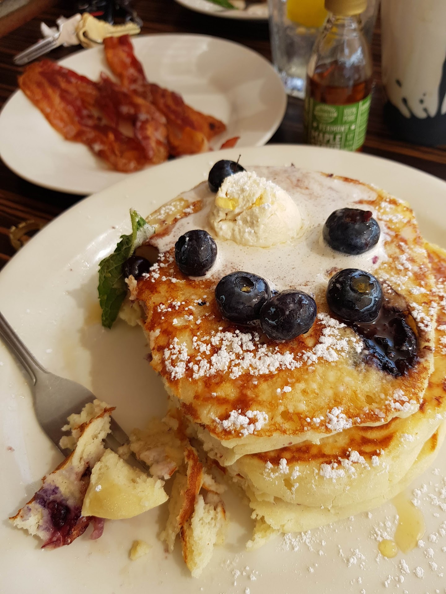 I, myself, have Celiac disease and require a strict gluten free diet. I couldn't believe the AMAZING gluten-free pancakes they have there! I had the tall stack, which are 3 HUGE pancakes and I ordered them with fresh blueberries, which is a dollar more but totally worth it, and I also paid a little extra for a small 1.7 oz bottle of pure Vermont maple syrup too. So, I did end up paying about $15 for my pancakes but, I couldn't even finish it. They are so fluffy and filling! My husband finished them off and couldn't believe they were gluten free. I had a side of bacon, which were cooked so crispy and weren't greasy at all. The second time I went, I had 2 eggs, bacon, homefries & gluten-free toast which was delicious but couldn't resist ordering the gluten-free pancakes as well and splitting them with my husband. Needless to say, we don't need to eat for 8 hours after we eat here! Lol The fact that you can order a Bloody Mary or a Mimosa is just icing on the cake. I haven't had any but have ordered the fresh squeezed orange juice, which is another upcharge but I can't get enough of it. 😋 I can't say what the inside of the restaurant looks like because we've chosen to sit outside everytime but I've heard it's pleasantly decorated. Unfortunately, right now the bar can't be used because of the restrictions.