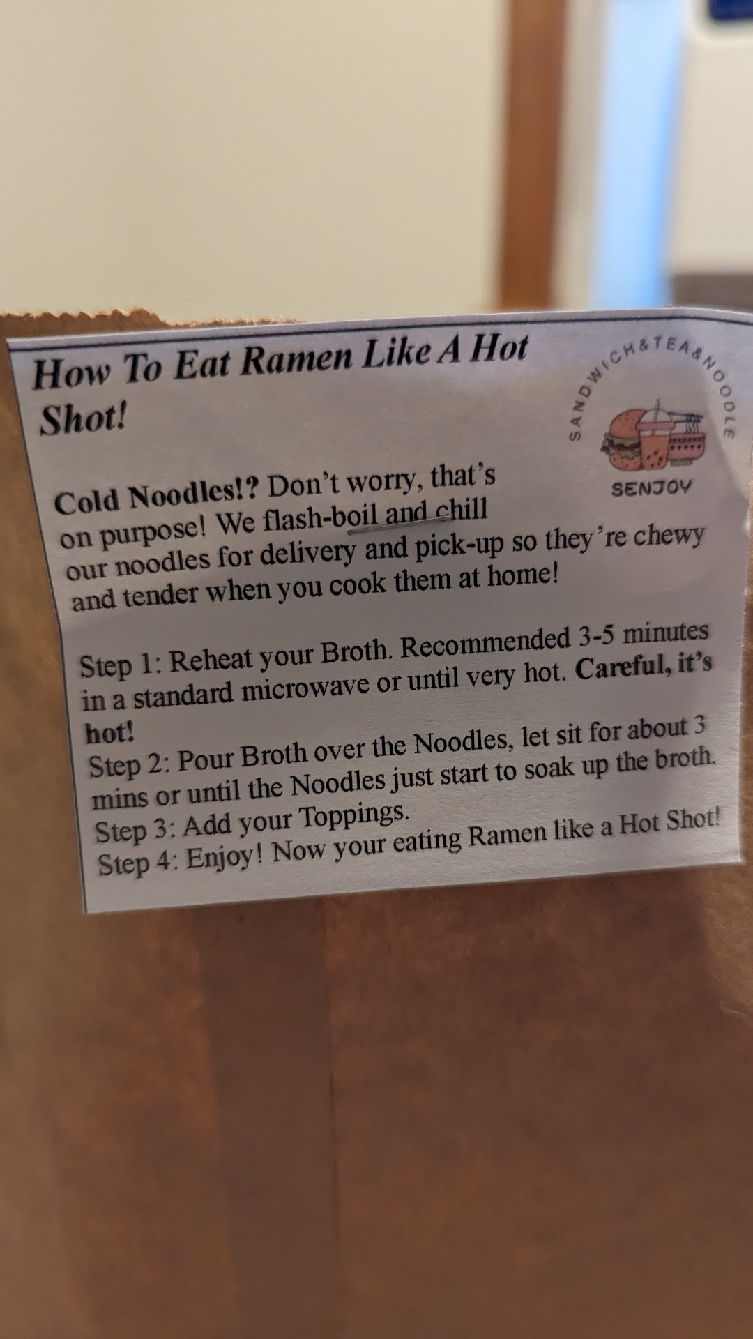 Read moreMy husband and I loved our ramen from Senjoy. The noodles were so perfect and the broth was delicious. We also had the pot stickers, Japanese chicken, and edamame. All of the food was carefully packaged and prepared. They even attach instructions on how to prepare your noodles from home to prevent them getting overcooked. Can't wait to go again, we are super happy to have a ramen...