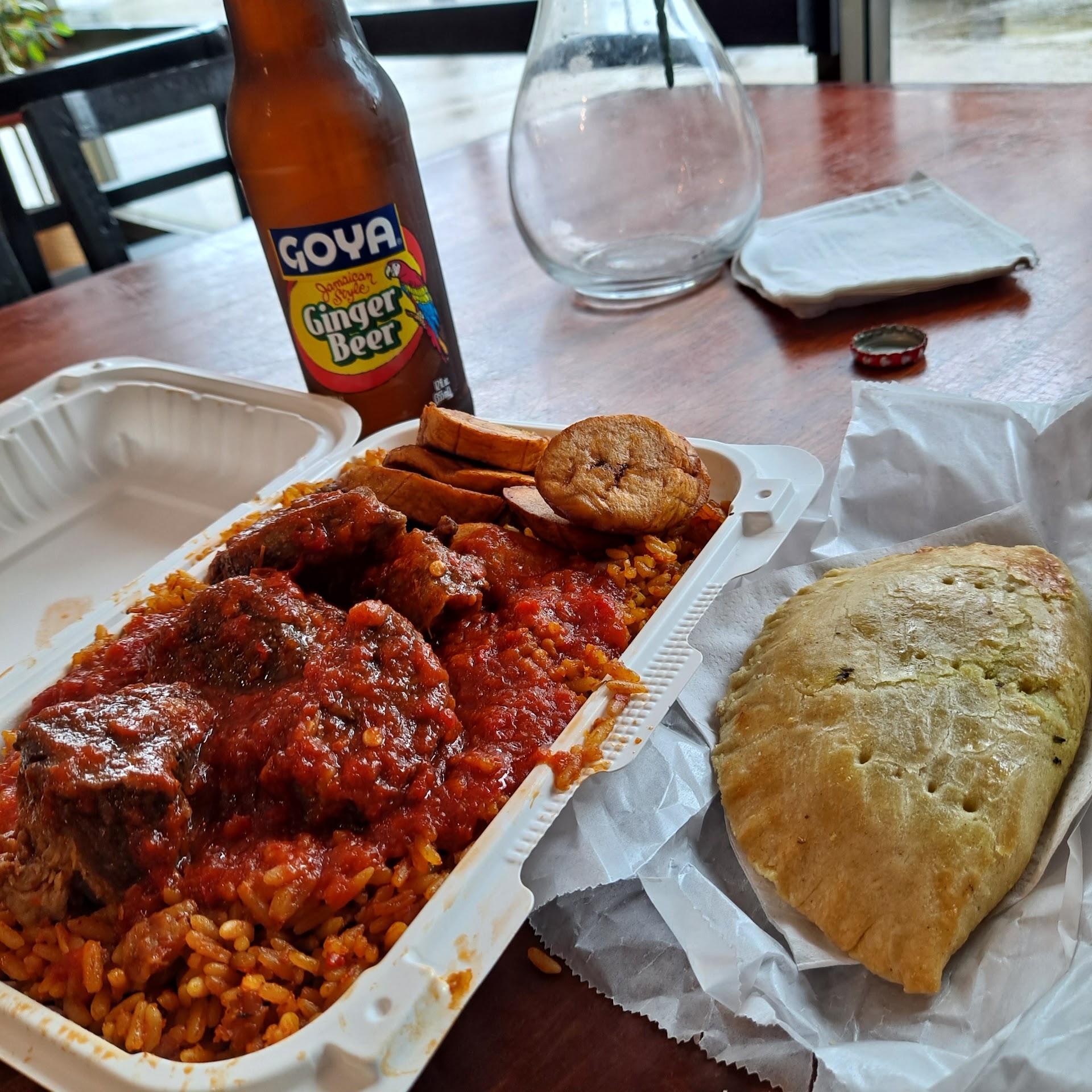 I walked in and was greeted by the sight of a cozy little place set up with a handful of tables, some menus on monitors, and a counter behind which lurked all sorts of delicious delights. The fellow manning the counter - who I would later discover was the manager - promptly took my order. I went with Jollof rice with beef, a meat pie, and a Goya brand Ginger Beer.