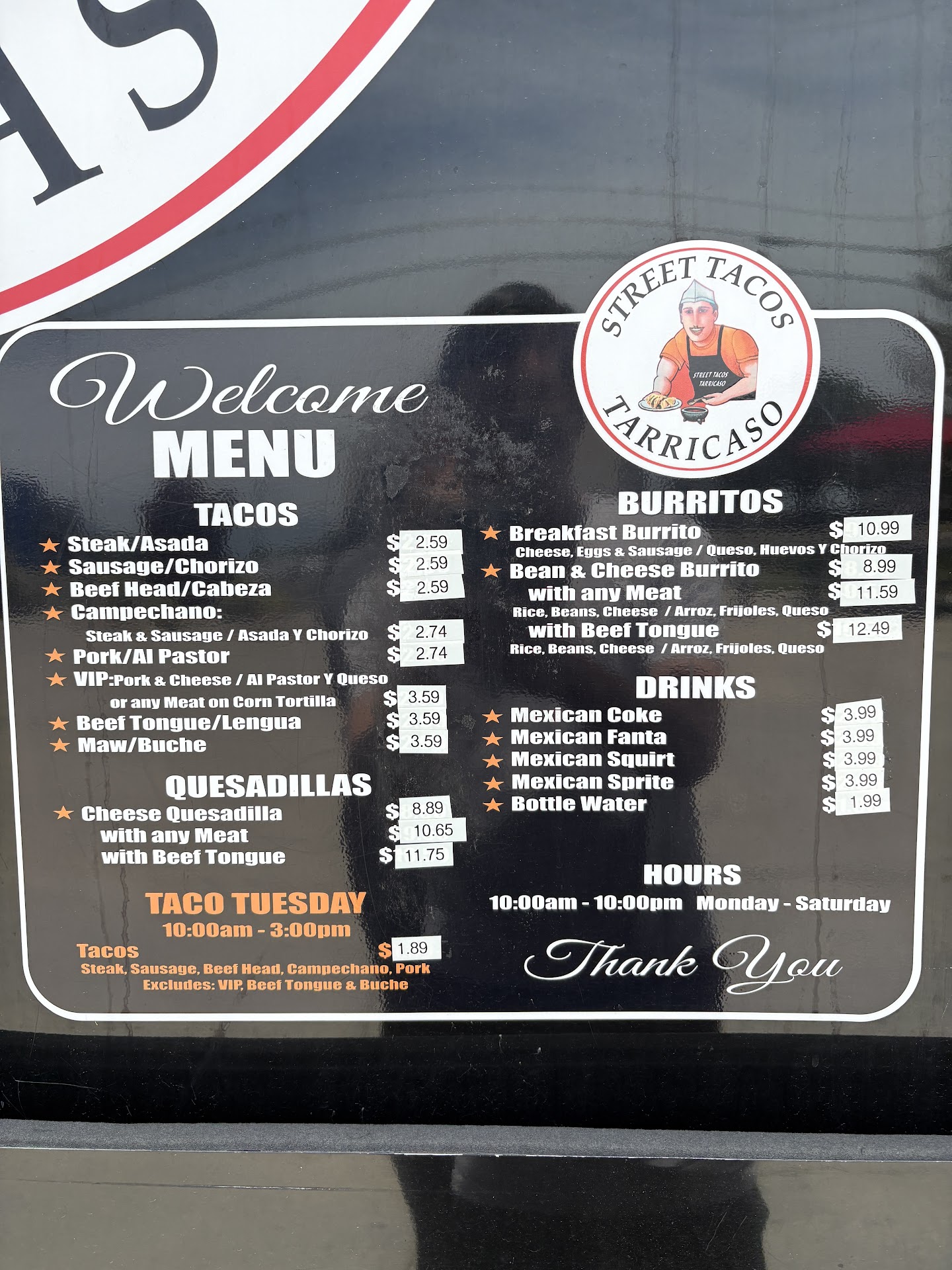 About $2 each for the street tacos, and $8 for the quesadilla. Imported Mexican sodas as well, Coke, Squirt,...
