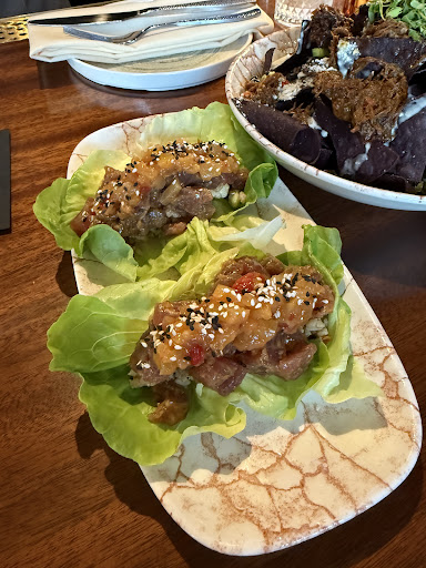 Read moreA wee bit saddened by the experience. A word to the wise, run if you are seated at the first table to the right when you enter. It is impossibly small. Not only is the length of the table oddly short but the benches leave little if any room to move comfortably. This area should be made for two people only but clearly they wanted to squeeze every bit of space to make some money. We went on a Sunday night and at 6:30 they were out of the ingredients for the wedge salad. My wife opted for the pizza which was average at best. I had the Phillip Burger which was impossible to eat because it fell apart. The place provided an absurdly small amount of sweet potatoe fries with my entree and the basket of sweet potato fries was clearly from the bottom of the bag as it was all tiny pieces. The mini serving board that the burger was on did not have scire marks to capture the grease from the burger so that ended up in the table and the serving board was too small. The desert list was memorized by staff, not a good move since this gives the customers little time to mull over the desert options and they did not have coffee. The bar is your best bet as far as comfort. Place is beautiful inside. Bathrooms super clean. Bottom line, you can get much better for the price you are paying. As an aside, the razberry and blueberry sangrias were indistinguishable in taste. Very disappointed. Plenty of parking in the immediate area so that's a plus and the music was great. Please get rid of that...