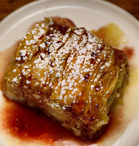 Dessert Galaktobouriko A creamy semolina custard wrapped in flaky pastry and drenched in honey syrup, topped with a cherry sauce. A refreshing alternative to baklava and an absolute must-try. 9/10