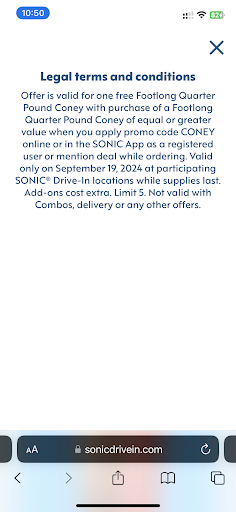 I would give 0 stars if I could. Pulled up around 10pm and had to find a stall that wasn’t covered in trash. I came for the Sep.19th buy one get one Quarter Pound Coney deal and ordered 2 dogs (not combos) and mentioned the deal. The deal was accepted and my friend and I waited. After about 10 minutes our food came out but there was only one hotdog. I asked for my other hot dog and they claimed that they were not going to honor the deal and that it was for the app only. I told them online said you could order at the window and mention it and they told me it was wrong. I then opened the website and showed them the details in the screenshot attached to this review which is straight from the website and claims that you can use the app in person. They told me that there manager had said they weren’t doing the deal anymore…. Even though the deal was only valid for today. They brought me my other dog 15-20 minutes later when my friend had finished all their food and then handed me another $8 bill for the second hot dog. I asked to have the manager come out and at least do it himself, so he did, he wandered out and proclaimed that his boss (the franchise owner I presume) told him to stop running the deal. I showed him the deal and he agreed it said it was qualified but that his boss told him no. WHOEVER is running this place is running a sham and it will go out of business like the rest. I’ve been once years ago and was excited to go back but I’ll never support this business and they need to coach their management because not honoring the deal would have been the last course of action if they cared about the customer. Don’t forget when I ordered originally they accepted it. Absolute sham and the manager Lucas has no backbone, in the end of the day it was his decision to not honor the deal right in front of him. Blaming your boss does not validate trash customer service and also makes whoever is at the top here look like total jerk. The add was the first thing on the website and doesn’t specify which locations are applicable and there’s no way to tell. Absolute bait and switch from a...