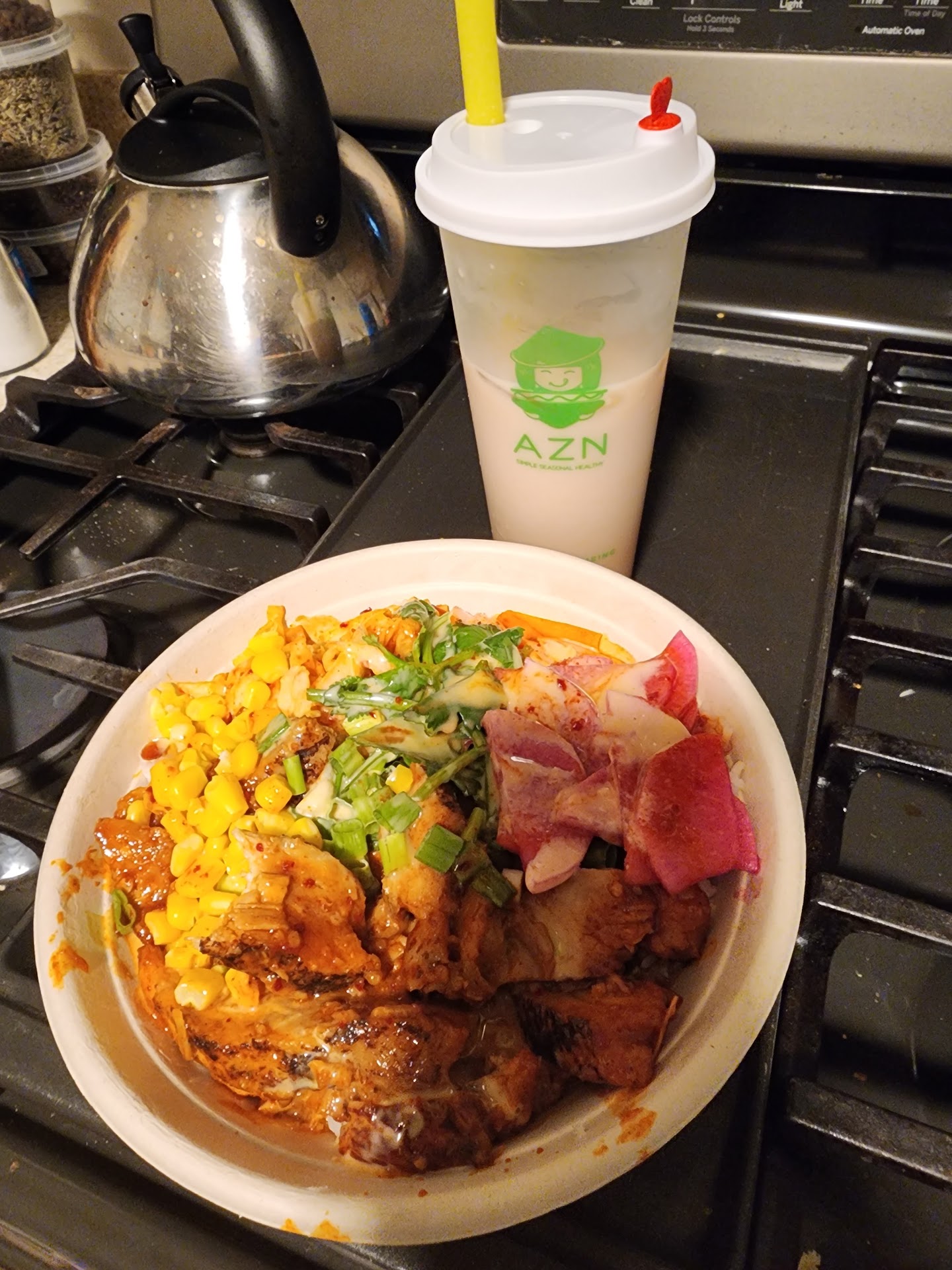 Basically you choose a bowl with rice, or noodles...or a sandwich, of 1 of 2 choice buns. Choose your meat, veggie, or tofu. Then add 5 additional veggies, etc to your bowl or sandwich. Seaweed salad, spinach, several veg choices, etc. Then ...add your sauce, or topping. That's it.