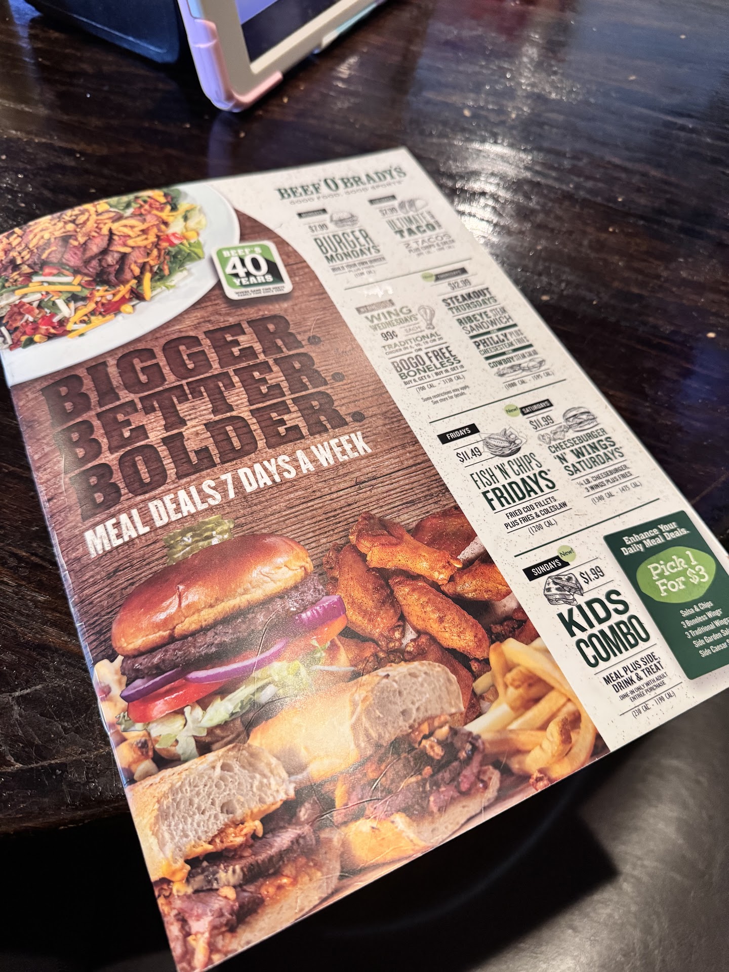 Read moreIt had been several years since I had been to Beef 'o' Brady's. We used to go there a lot when our daughter was in high school cuz there's always some school event, or club or something happening. And I always thought of their food as being very heavy.... A lot of starches, fried, and gravy. And when we think about where we want to pick up we would never think about there because gravy and mashed potatoes and meatloaf in a star from dish never seemed very appealing to me or a soggy greasy hamburger that got cold. Although they still use Styrofoam, The food itself has completely been reimagined to be much more healthier and lighter. I had a salad with a piece of white fish on top that was really quite delicious and a lot of food. The chicken breast with broccoli and rice was perfectly cooked for somebody with that preference. In my husband was still able to get his mashed potatoes and gravy. Service is good. Decor is predictable for this kind of a chain. It will be my new favorite place for getting real food for takeout, as well taking out of town guests there We read out for a reasonably priced wide...