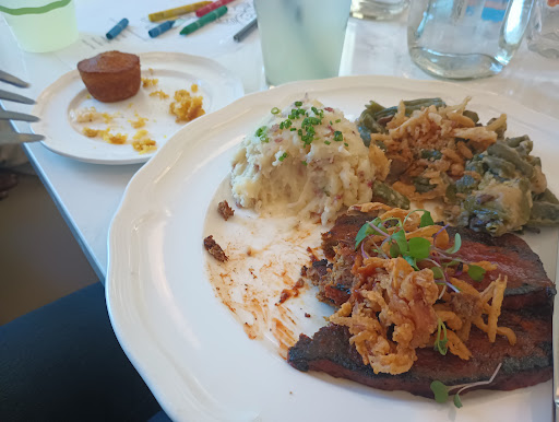 Read moreThis is a lovely restaurant and right next to a cool consignment shop so suggested it for a girlfriend lunch. Service was impeccable- friendly and attentive without being intrusive. Loved the booth seating and the wall to wall windows - light and airy. The issue of air conditioning someone else mentioned seems to be resolved because it was cool and comfortable on a day with 100 degree temps.My friends and I stayed for 3 hours and had a wonderful time together. We had mixed results with the food. My friends had the rotisserie chicken and loved it. I had the blueberry peach salad and a vegetable plate. The collard greens and cornbread were amazing. Best I’ve ever had and I grew up in Georgia. I had French fries with gravy as a treat. The fries were fine but the gravy was a little too confusing in flavor and salty combined with the fries which were also salted. The black eyed peas were cooked well - neither mushy or hard, but too bland. A pity because they are a favorite of mine. The Cole slaw was creative with jalapeño and onion which I don’t care for but my friend ate it and she liked it a lot. The salad was the big disappointment - skimpy toppings and the peaches had been grilled on the meat grill and tasted of meat more than peach. The pickled blueberries, and the small amount of goat cheese, pecans, and salad dressing were nice but the peaches made it impossible to eat. I also tried the coffee and strawberry lemon shortcake. Coffee was very bitter even with a lot of cream. The cake was just wrong. Instead of a light plain cake or even plain pound cake it was an iced lemon pound cake which was too sweet and overpowered the dish. The lemon curd did not look fresh - more brown than yellow and really lacked any zing. The star of the show - the strawberries? Just awful. Not fresh as described but sliced and clearly soaked for a while in sugar and water because they were dull gray and chewy. (they said not overnight, but that’s how they looked and tasted) Since I picked the venue, I’m glad my friends had better luck ordering than I did! Overall I enjoyed my time there and would definitely go back for the...