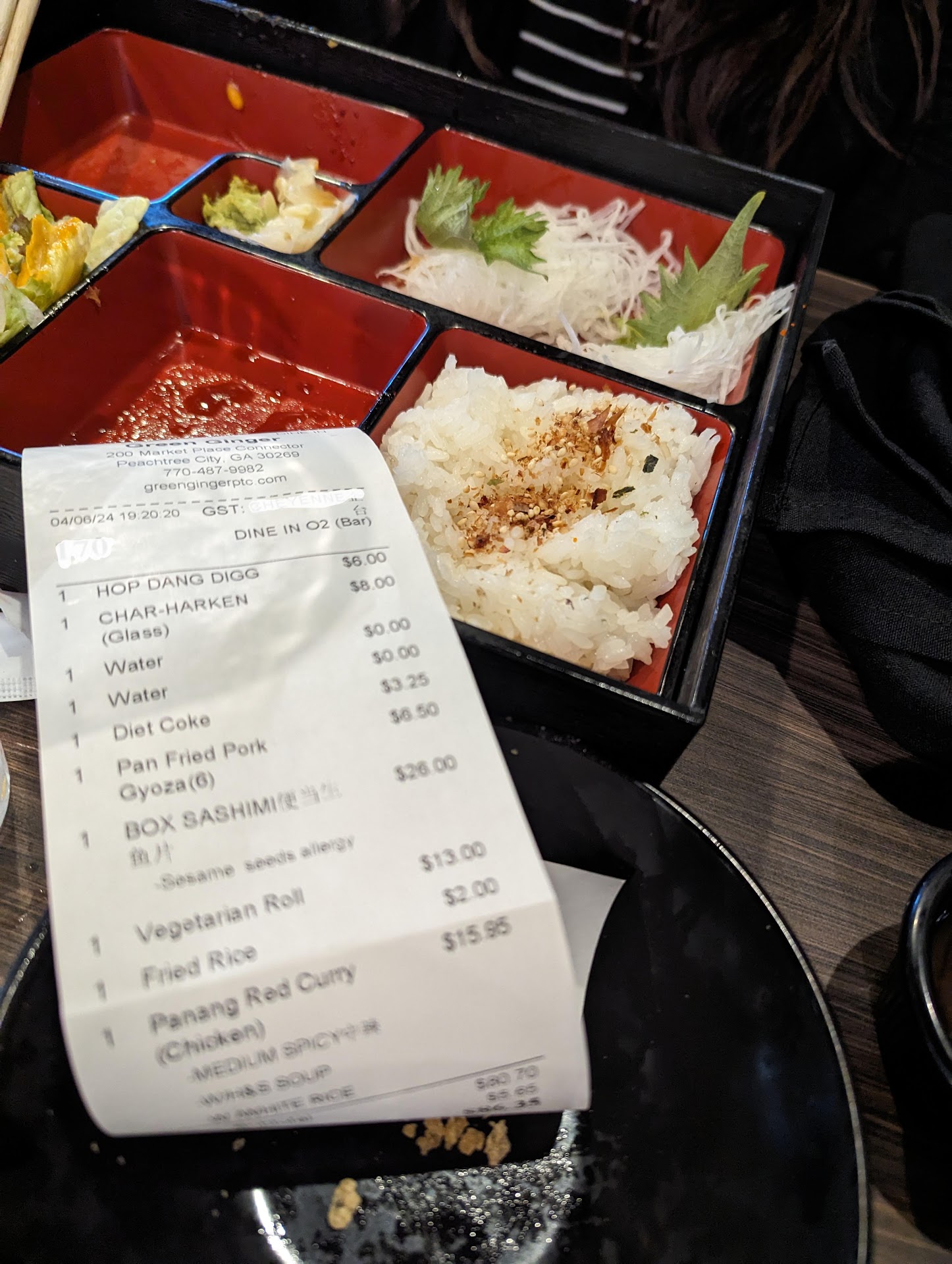 After my entire party finished eating, 35 minutes after placing our order, our waitress finally came back to see how the food was. Never mind that everyone's drinks were empty shortly after the food came and we had long given up on refills. I showed the waitress my wife's plate with the sesame covered rice, she was shocked and said that she had specifically noted the allergy and apologized. No other explanation was given, and she asked if we wanted any desert or just the check. When the check came, it was clear that the allergy was noted (see the photo) but the kitchen did not omit the sesame seeds. Nor did she bring our food out to us, nor did she come to check on us at any other time during our meal in which we could have easily had the situation resolved.