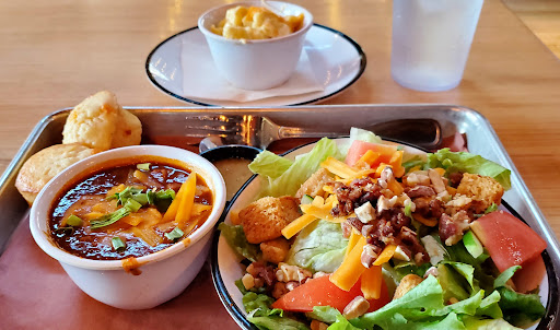 We did not have to wait long for our food. The young lady and young man that brought our orders made sure we had everything we needed and she came back to double check everything was OK. The 2 meats combo (pulled pork and chicken) with corn on the cob and fries were very good and the meat was moist. I had the salad with bacon and their version of chili with brisket. The garden salad was fresh and crunchy. The chili seem to have more of the fatty part of the brisket. The flavor was delicious!Oh! The corn muffins were DELICIOUS also!! The Mac and cheese was a little dry (parts of the cheese on top was a little hard.... wonder if it was leftover from lunch or sat out too long?). It still was edible. That was the only "negative" part of our visit. We did come with about an hour left before closing. Not a big deal breaker in comparison to the entire meal and positive first experience.