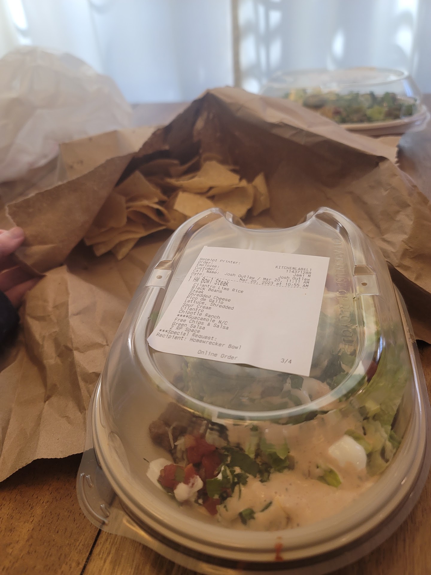 This most recent trip, my husband picked up his order as soon as it opened (the receipt even says 10.55, so this is first thing). His entree was the complete wrong entree (a salad bowl instead of a burrito), wrong drink, and the number of chips for 2 entrees purchased is just insulting. Please include chips for the correct number of meals.
