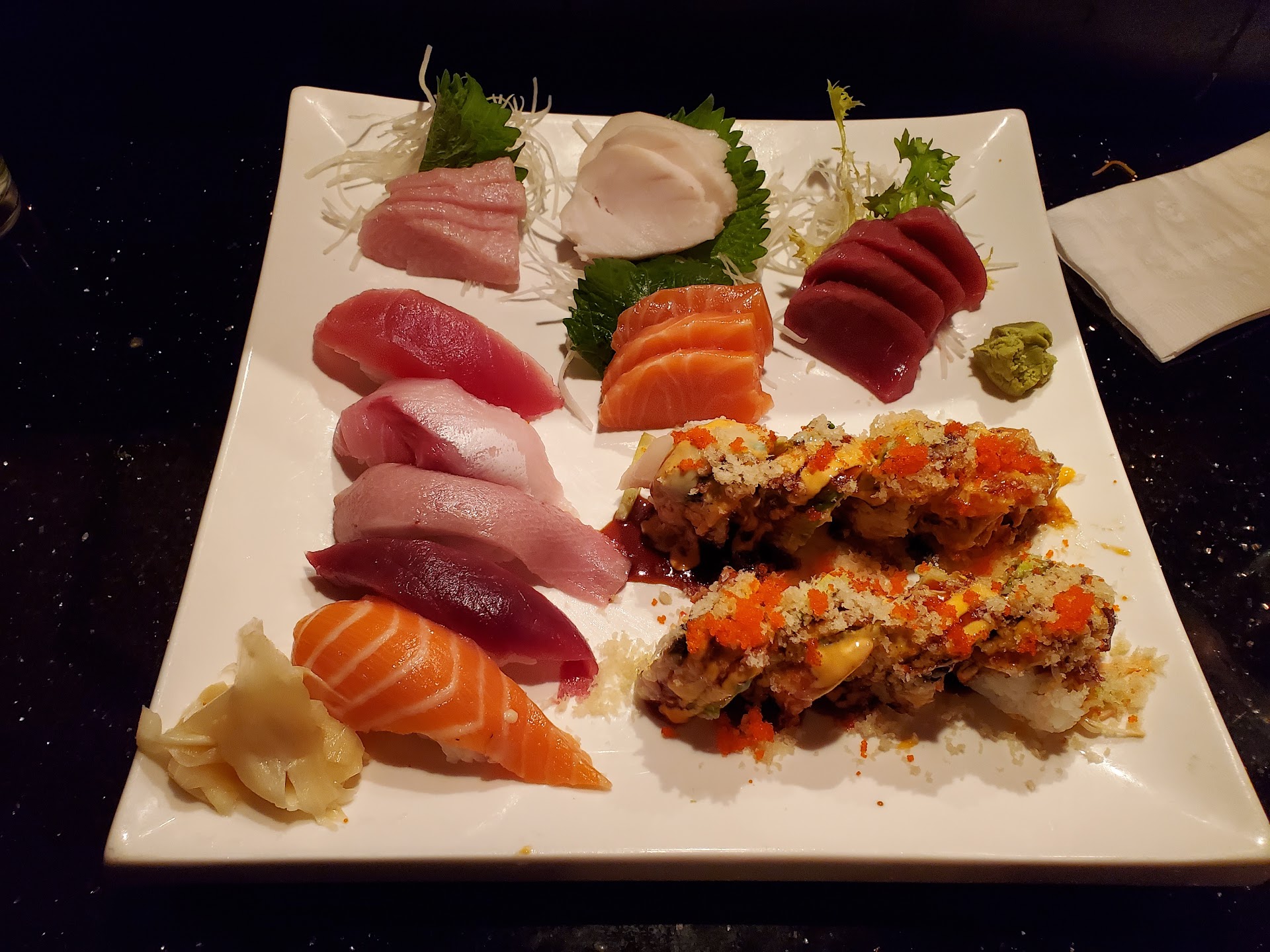 We were the first people in the door. We ordered some sashimi, and a couple of rolls. The sweet potato rolls were on point, so, so good. Wife had a volcano roll that she liked, I thought the salmon portion was a bit heady. I got some yellowtail that was really good. I also ordered some mackerel and a dragon roll. The mackerel was squishy and smelly, right at the point of not being desirable to serve. I was very disappointed that the chef let that go. The dragon roll was so wet and squishy it may as well have been a casserole entree. It was a substandard soggy, formless, and drippy presentation that never should have hit the table.