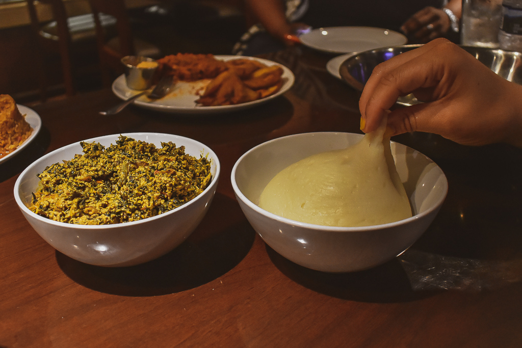 I ordered the Egusi soup with pounded yam (fufu) and jollaf rice. Now, I don’t want to say this, but the smell of the soup was strong! It’s a unique way to eat this. You have to pinch off a piece of the fufu, which can be sticky, and roll it around in your hand and grab the soup. Don’t use utensils, really get in there and enjoy it the traditional way.