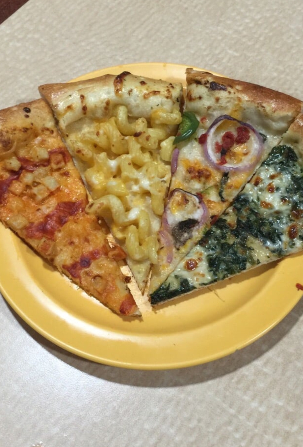 The food? You get what you pay for. It's cheap, low-quality junk food. It's... edible. Mostly. But you can stuff your face with it until you puke, so there's not a lot of room to complain. Don't come here with high, or hell, even medium expectations. The salad bar, sadly, is actually the best part of the buffet line; it has all the basics, usually, and only occasionally disappoints. The pizza itself barely rises to the level of elementary school cafeteria food.