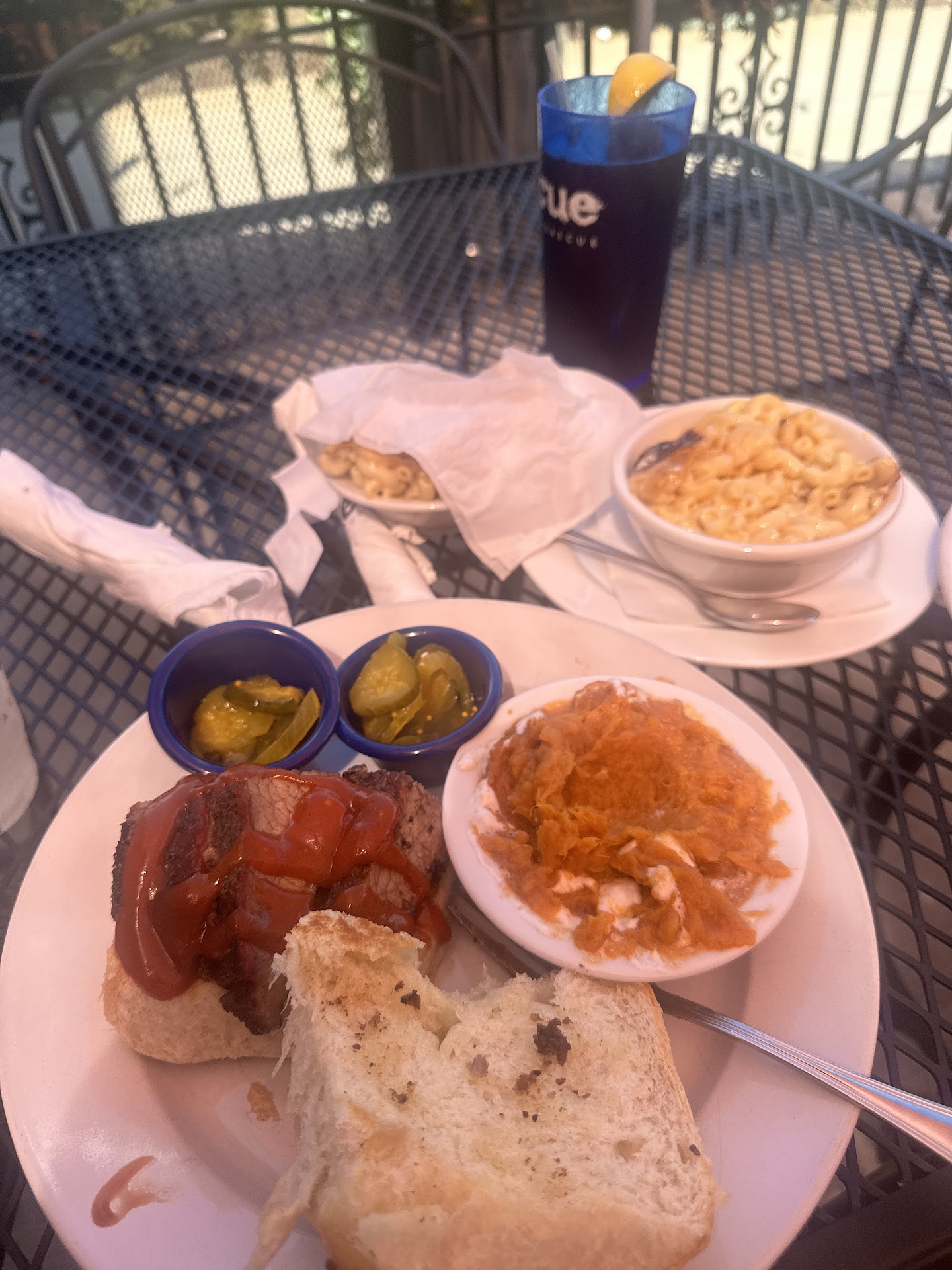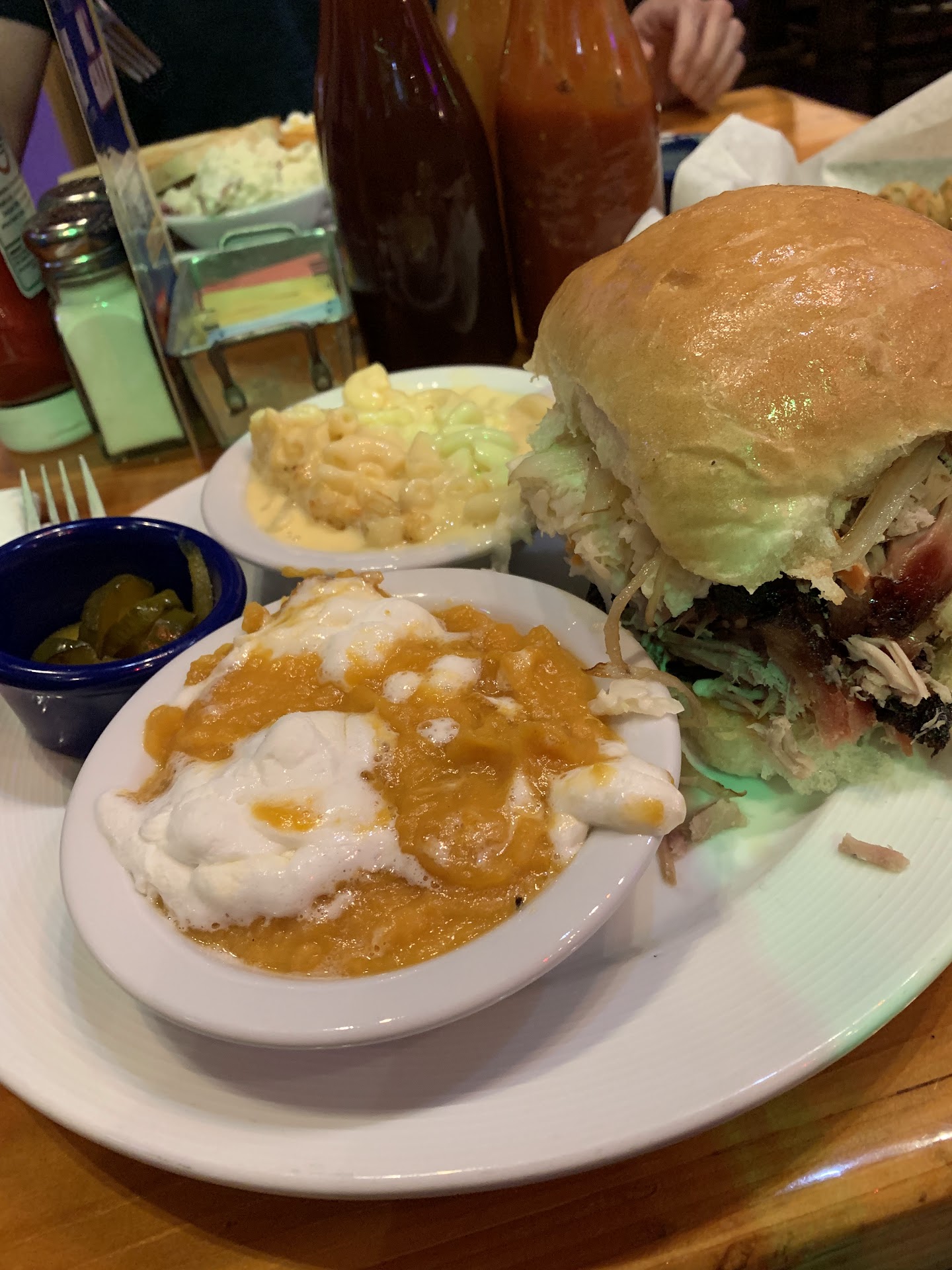 The food itself was mediocre, we’ve had better barbecue elsewhere. We ordered the bbq nachos which were room temperature black beans more than anything. I had the chopped pork with potato salad and sweet potato. I liked everything except the potato salad. My husband ordered their chicken sandwich with cheese added to it which he enjoyed but wasn’t exactly crazy about.