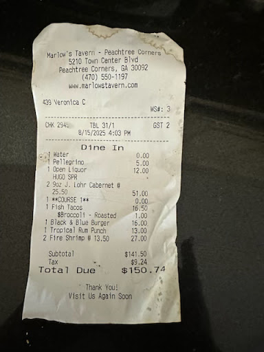 Read moreI was at Marlow's yesterday in Peachtree Corners late afternoon with a guest visiting me as Marlow's has always been a go to spot for my husband and I, kids when visiting, guests and friends. We live right in John's Creek and have enjoyed Marlow's for the last 4 years since moving here from NY. I am not complaining about the food and never have, however when I received the bill yesterday and was charged $51.00 for 2 glasses of wine I had to literally compose myself from go crazy. Firstly, my husband is a liquor distributor, so I know alcohol and wine pricing. I have been drinking J.lhor for years and of course I know the price of a bottle. $12.99 a bottle at Total Wines and 12.99 at Local Vines right around the corner from my home. How do you have the nerve to charge me $25.50 for a 9 ounce glass of wine when the I can get (2) bottles for the 2 glasses you charged me. The manager who was lovely came over after I told the waitress to please go to the bar and double check this price or I will get up and go to the bar and handle myself. I felt as though the manager herself was a bit thrown and really could not justify the pricing and when she checked what 4 ounces was which is nothing, that was $18.00 so she could say no more. Ridiculous. I responded with next time I come I will bring my own bottle of wine and she actually said that would be fine. Unfortunately there will be no next time. My family and I will never return to Marlow's anywhere in Georgia. I resent an establishment attempting to gouge and I certainly do not appreciate being taken advantage off. 4 drinks came up to $76.00. How does one justify that the drinks came out to be more than the meal. A burger for me and a Fish Tacos for my girlfriend. Again, highway robbery and sadly I will continue to Patronize Firebirds and other establishments near me but sadly this wine episode with Marlow's has ended our customer...