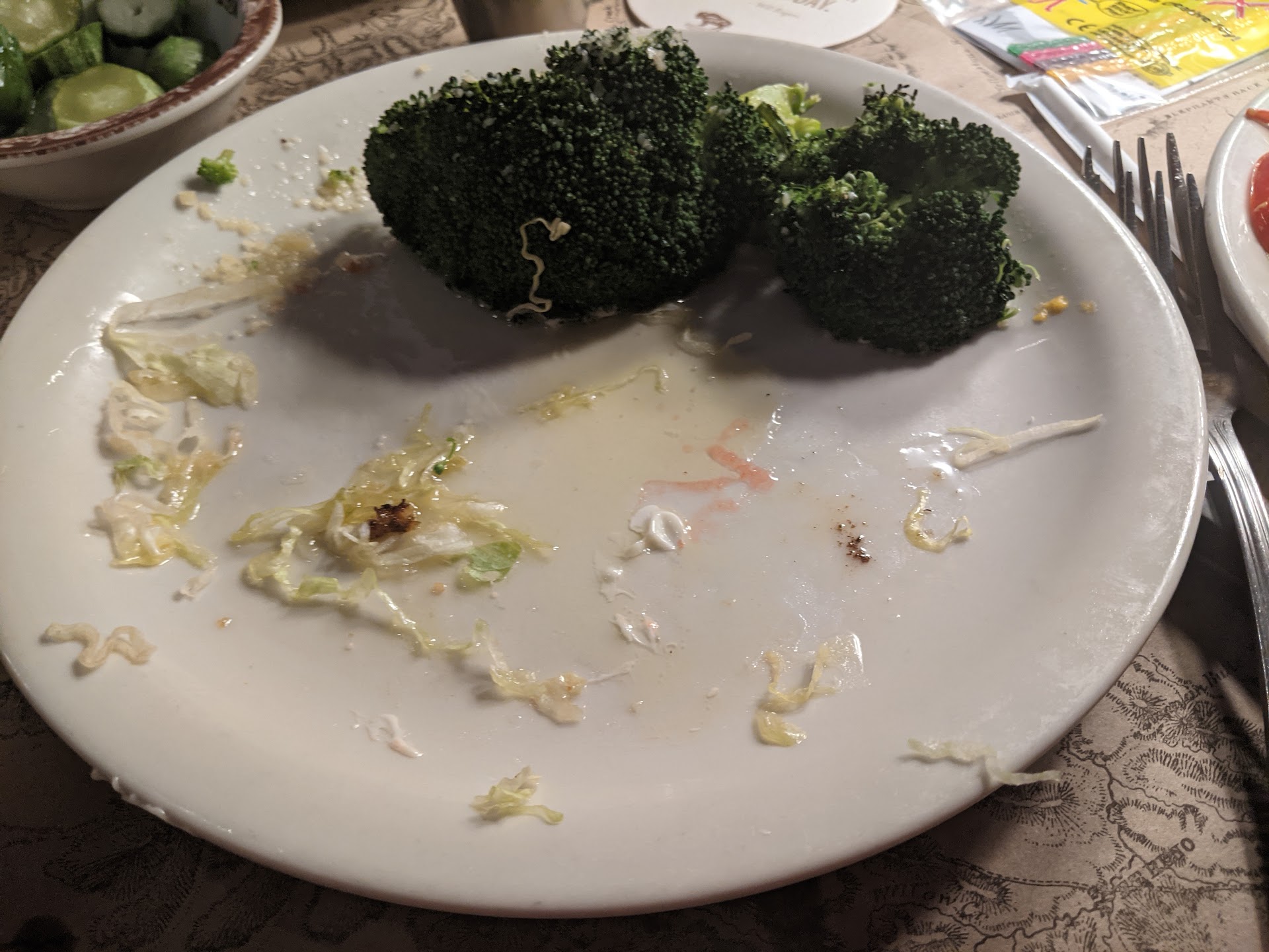 We had Mother's day reservations for eight at 12:30. The restaurant wasn't busy yet, and our table(s) were in the front aisle: Two tables pushed together of slightly different heights so, with three seats per side, the middle person sat on the hump between the two tables. My friend and I, being gentlemen, sat at the aisle end, so our wives sat at the hump between the tables. They noticed it, but did not make a fuss. (So don't plan to eat in a party of over six people or someone will not have a good seat at the table.) They serve complementary 'House' Pickles, but they were very immature and not pickled enough. Taste was not bad, but not very pickle-like. At least they were crunchy. They don't offer complementary bread, so I ordered some. The rolls were cool and doughy inside - very under-baked.