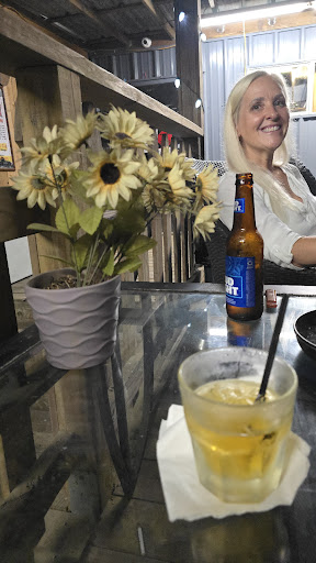 Seating is outside, bar inside is smoking. Theyāre working to screen in the dining area, they do have the fly swatting spinners to deter bugs. Try to pay cash, as the menu indicates a 5% discount. Beers reasonably priced outside of happy hour, but sold out of the bar in the main building.