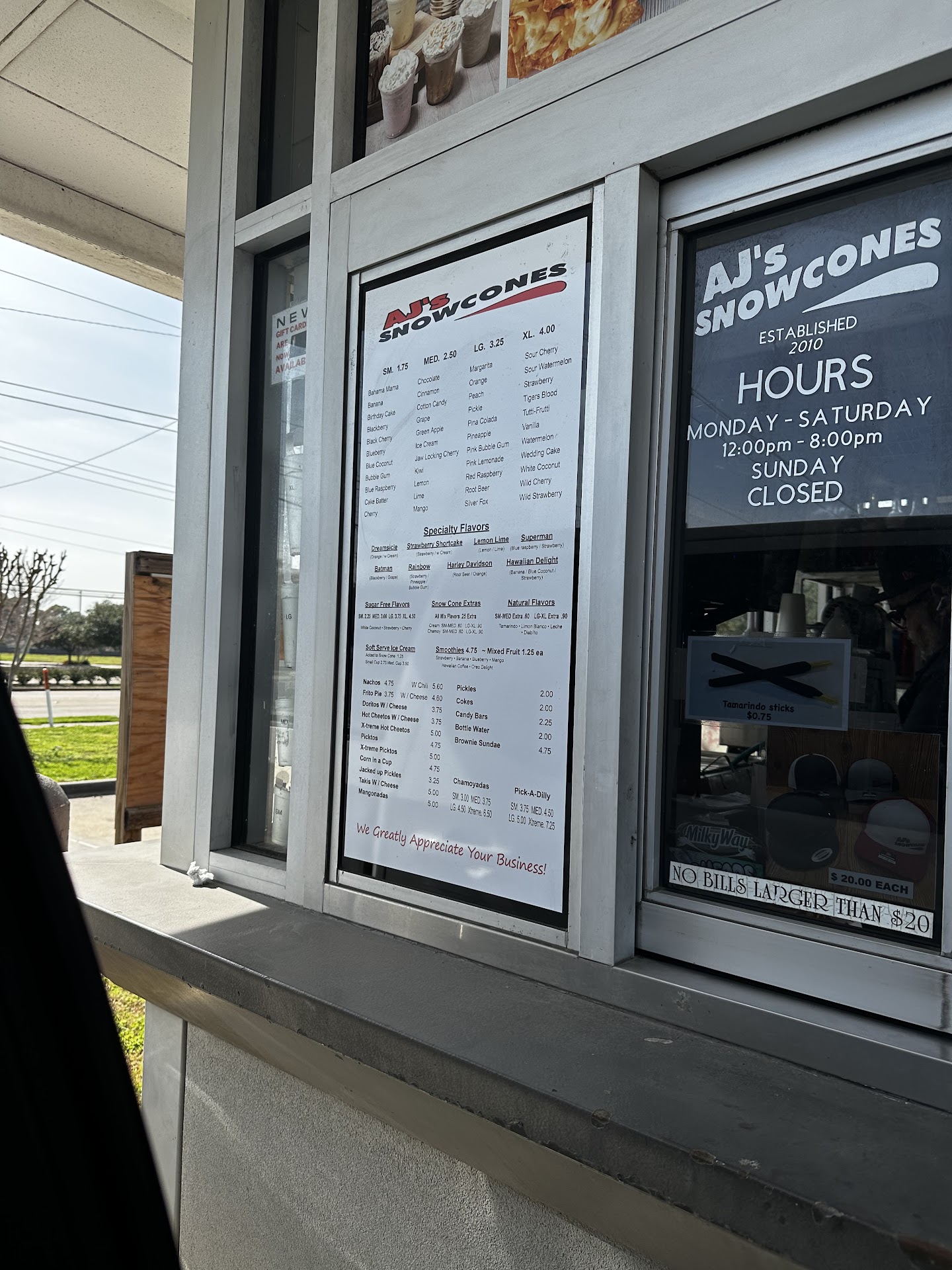 Read moreIt's been ages since having a snow cone, and those treats of yore were good but icy and crunchy. Not so with AJ's! We stopped by on a Texas-hot Monday afternoon to sample something cold. Wow. Are these fantastic! I got Dreamsicle while my hubs got sugar-free banana. No idea what magic creates this kind of ice shaving, but it's almost soft and fine enough to be mistaken for sherbet. Generous portions and extremely fresh. I spied Frito pie and corn-in-a-cup on the menu, so we'll sample those another time. Whether by design or happy little Bob Ross accident, the drive-through window is on the east side of the building and shaded with trees, so the brief wait was very pleasant. Friendly service with smiles....