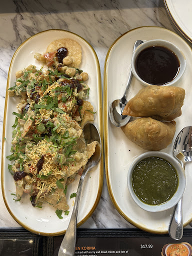 For appetizers, we ordered the Lamb Samosa and Papri Chaat—both were absolutely delicious! Before our appetizers even arrived, Devyani brought us a Mango Lassi to try since it was our first visit, and it was so refreshing and tasty.