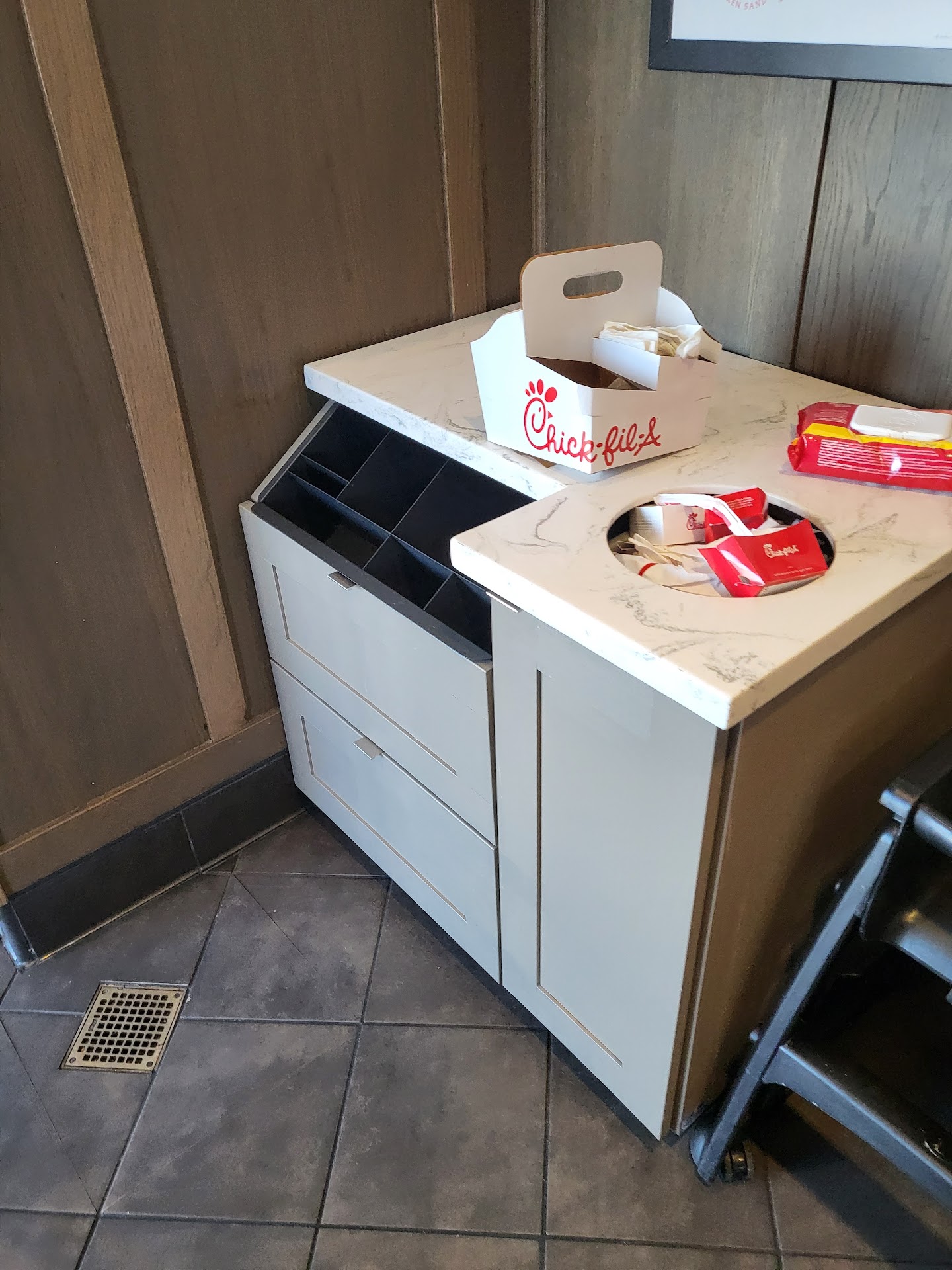 Worst dine-in experienve at cfa. Jake Smith @East Pearland would never. Walked in with my wife just before 3pm (not busy) and there was one person in front of us and 3 more behind came in. Stood for at least 3-4 minutes waiting for our orders to be taken which shouldn't have happened given that there were 2 leads and an employee just standing there talking, one of which made eye contact with us several times before finally coming to the register. Worst part of our time there was the dining room which was disgusting. Every trash can was overflowing, tables weren't clean, floors were wet or sticky, and they had no staff member checking on tables for refills, trash, or anything. Mind you the dining room had about 6 tables occupied. When they brought our food they didn't give us any napkins with it, nor did they offer refills or to get us anything else we may have needed. My food was fine except both of our fries were pretty skimpy. My wife's 3ct strips were basically XL nuggets, no bigger than my pinky. And for $5? Definitely sticking with East Pearland from here on.