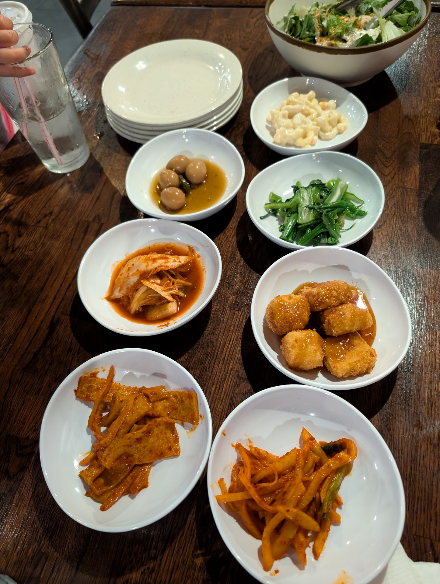 I have to say I was excited to see they give you all these little samples of food while you are waiting for your order! The kimchi, pickled cucumber and tofu were my favorite. Not sure why a Korean place is offering American macaroni salad and plain mashed potatoes; maybe it’s a thing in Korea? I don’t know. I need to go educate myself on Korean food and culture. But they were plain and pretty tasteless. Not American. White American. It was gross. We had reservations for an upscale American place but my husband (Indian born) did not want American food. So we were pretty disappointed to eat even worse American food at a Korean place. My mushroom and tofu soup lacked flavor big time but the tofu and mushroom were cooked how I like it. Honestly I would order it again but take it home and fix it up 😂.