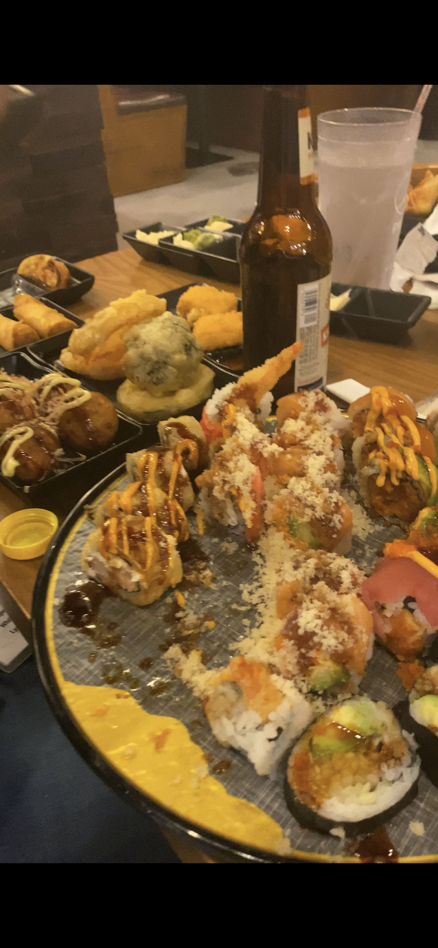 Food: Yelp doesn't say it here but this is also an ALL YOU CAN EAT sushi spot... if you can't finish it you pay extra but DEAR LORD is it amazing! The fried sushi is... ehhh except for maybe the Queen Roll.... But forego your large bellied Texan roots and go for the absolute DIVINITY that is the Eel roll! I decided to NOT do that and had so much tempura I almost made myself sick! The food is rich, amazing, and very filling! If you aren't a fan of just two "small" sushi rolls then have no fear-- this is NOT a place that knows what a "small" roll is, and with the AYCE? MULTIPLE rolls!