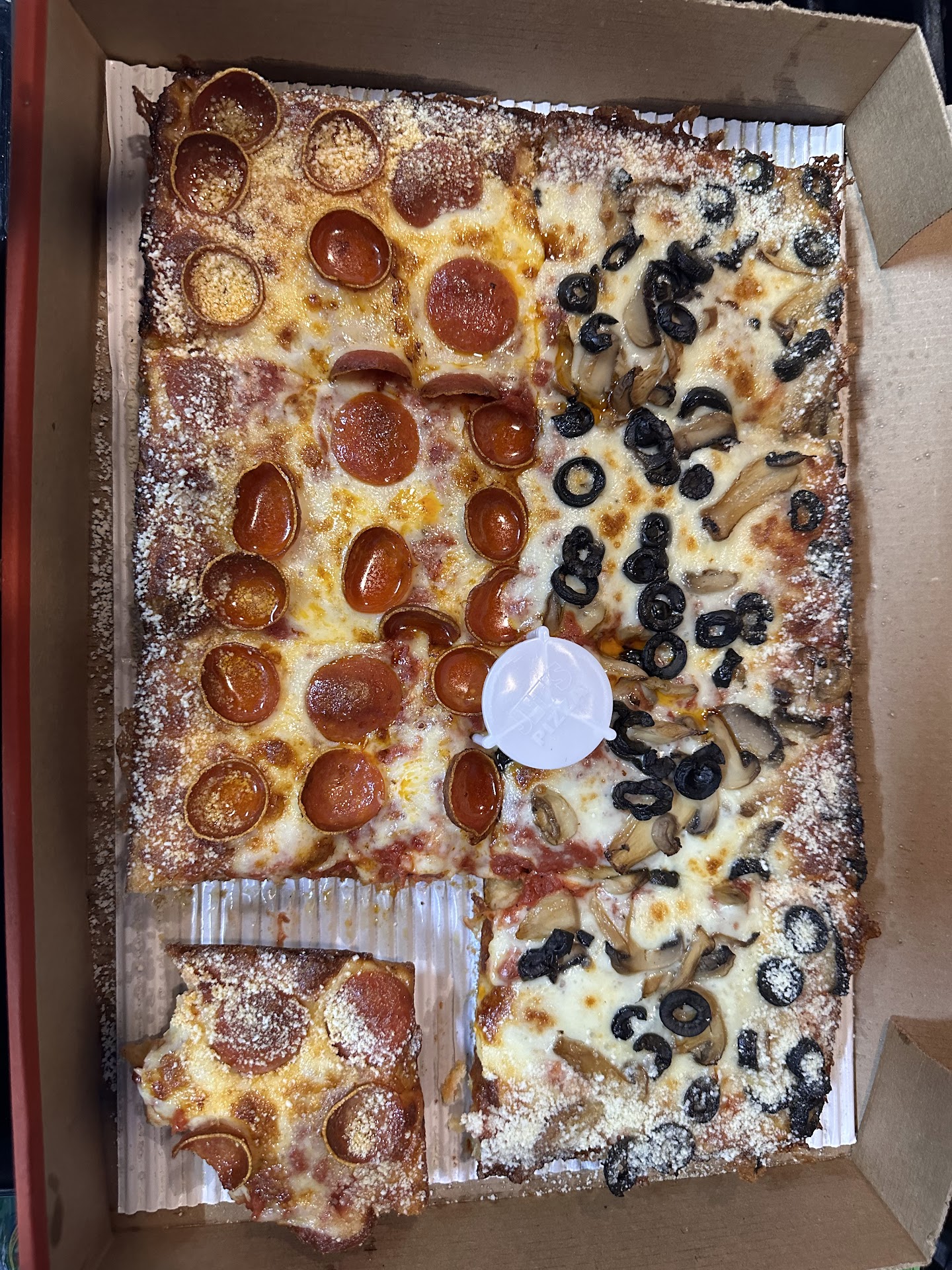The best take out pizza you can get! Theyâre always consistent with our order and the pizza is better than these other big name franchises. We are a family of 3 and share a large Detroit style. The pizza is always ALWAYS perfectly divided! When we pull apart a slice, we wonât get the toppings from the other half on our portion! My husband loves bold cupped pepperoni on his side and my daughter and I prefer mushroom and olives on our half. I love that they know me by now because I always order a side of pineapples, and they have it ready for me. My daughter doesnât like pineapples on our half of the pizza so I have to do this every time. lol The service is great! Everyone is pretty chill too. We havenât tried our pizza any other way besides Detroit style. I can eat up to 4 slices of pizza at any other place, until I get full, but I only need two slices with Jets Detroit style to be satisfied! Itâs full of flavor, the sauce is tasty and we get it well done since the crust is so thick. I highly recommend the âturboâ crust to give it extra flavor and ditching all the other big name pizza companies. Youâll spend a bit more but itâs really about the quality and consistency this place holds. Yâall are doing an...