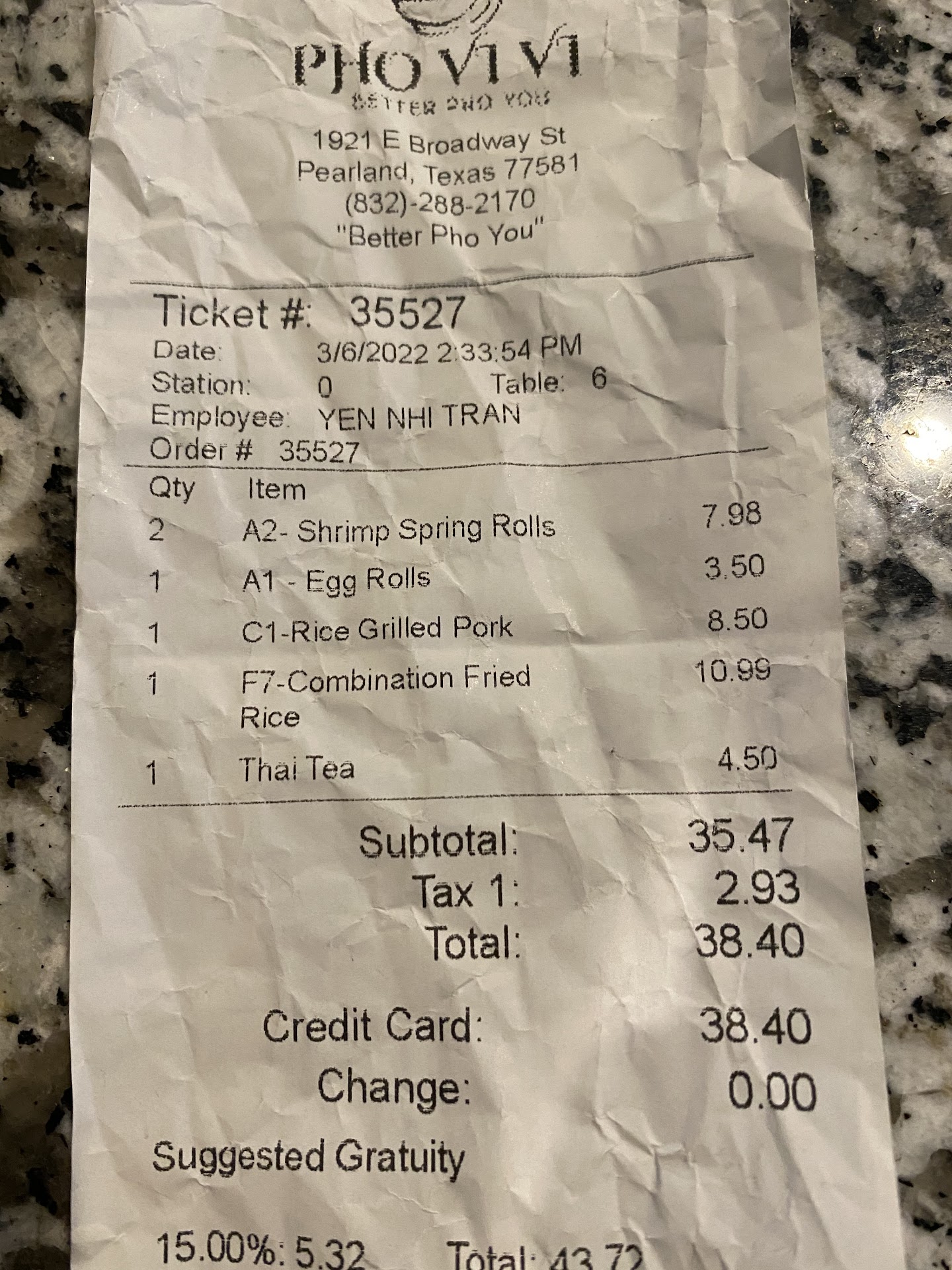 Ordered Uber eats from the Pho VI Vi that I assumed was in Pasadena (closest to my house and consistently delicious). For some reason I ended up getting food from this location. Not only did it take about an hour and a half to arrive, it was dried out and disgusting when it finally did. I paid a $1.50 upcharge (×2) for the noodles, which ended up being more like spaghetti noodles vs. the rice noodles that I paid extra for. The orange and general tso chicken was worse than the cheapest chinese buffet that you could ever imagine... 98% breading to 2% chicken. When I called the restaurant, I was informed by the employee who answered the phone that it was not there problem and that I needed to deal with Uber Eats. Uber Eats did their job by delivering, although slowly, the food. The quality of the food is 100% on Pho Vi Vi in Pearland, TX. Goodluck if you choose to eat here. I do...