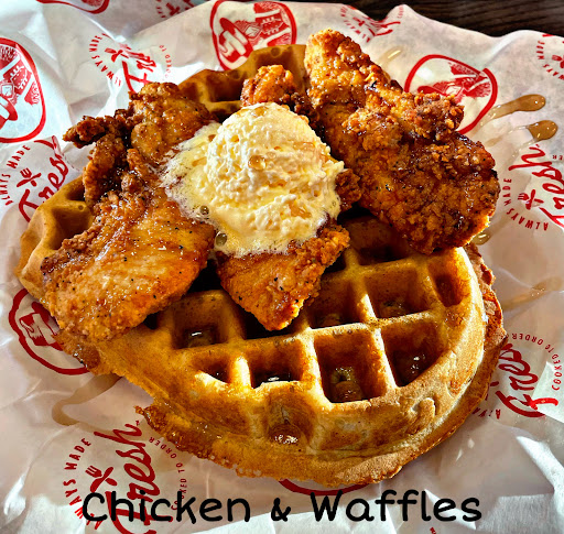Chicken and Waffles. 9/10 Three tenders served over a perfectly made waffle topped with butter and syrup. Served with a drink. I have had chicken and waffles from everyplace I can imagine. This is just as good as the heavyweights of C&W. The tenders are seasoned and cooked perfectly. The waffle alone is better than any breakfast joint around. The melted butter and syrup rounds out the meal to perfection or as close as it could be.