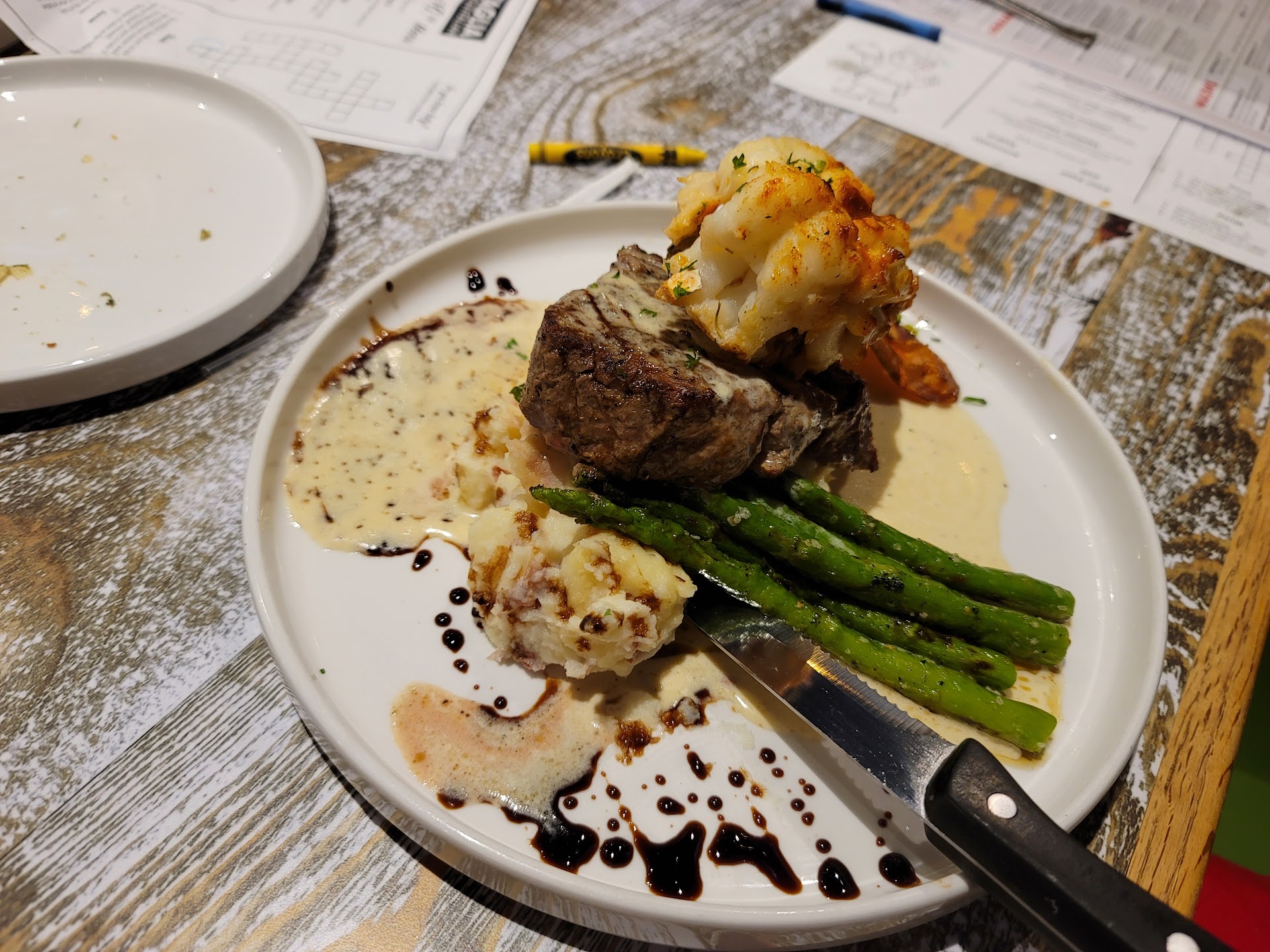 The surf n turf was a home run. The Filet was so tender, and delicious! The filet melted in the mouth, and the lobster was also great. It was served with asparagus which were perfectly cooked and delicious.