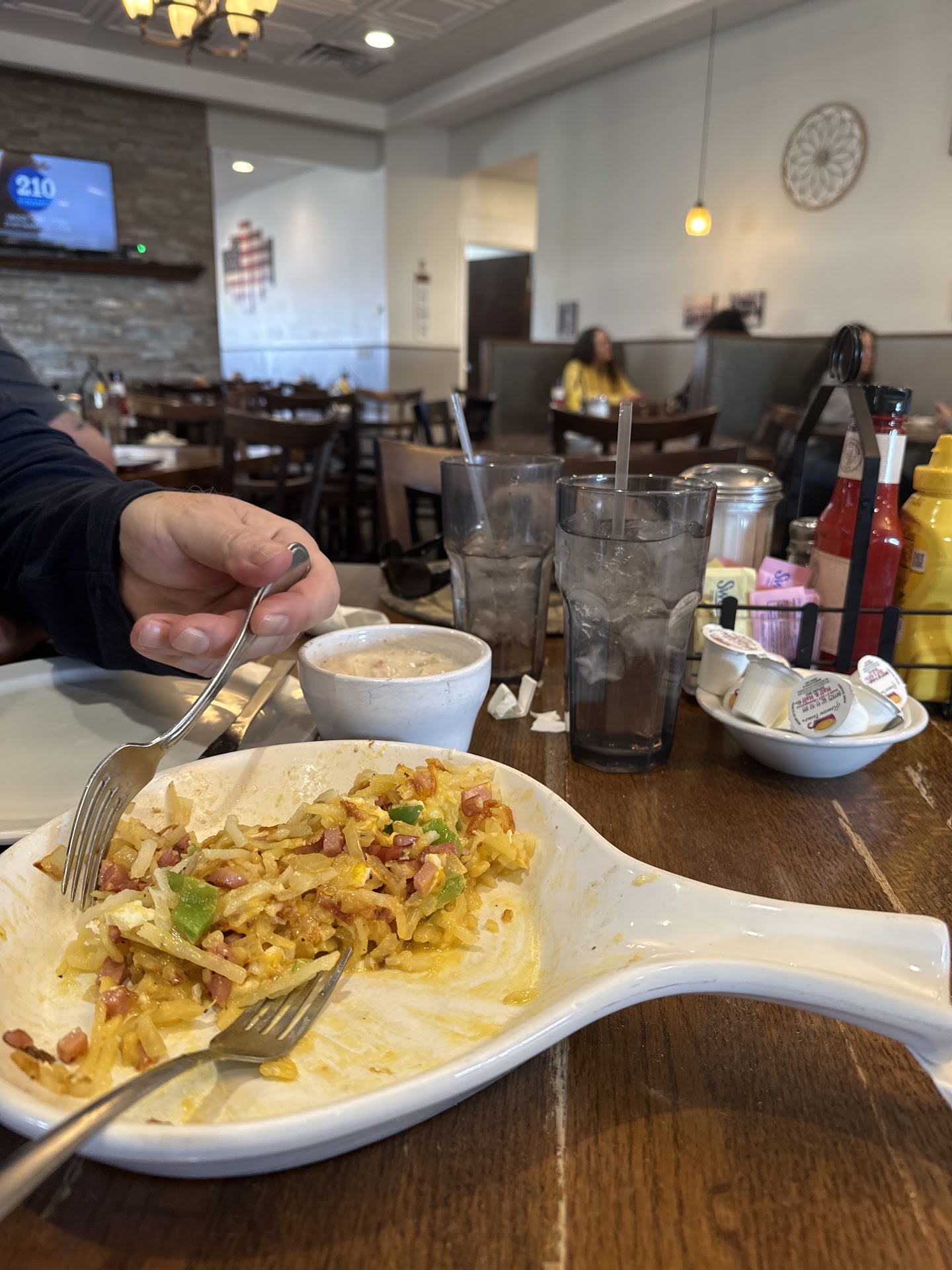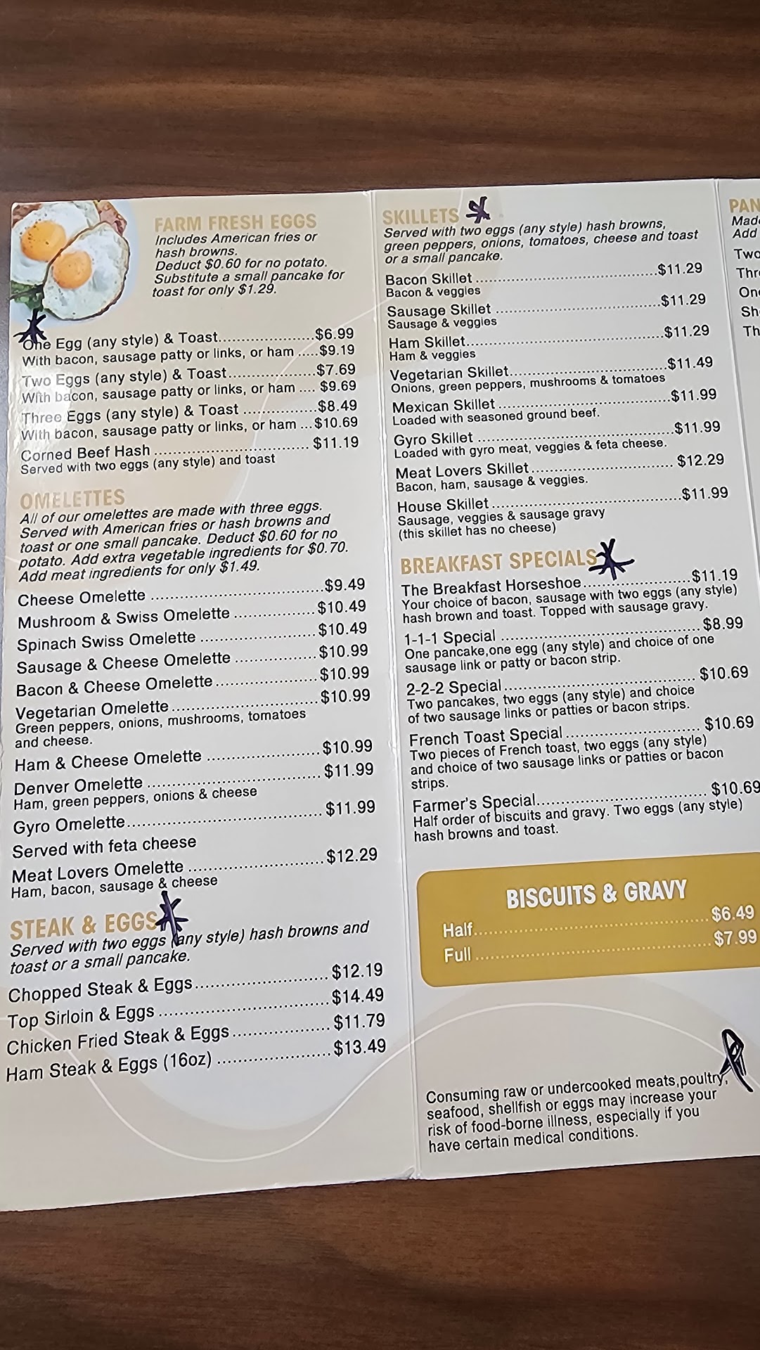 Read moreWe had breakfast here for the first time today. I'm pleased to report that this is our new home town breakfast location! The dining room was spotless (not always a given in this town), and the service prompt and courteous. Both my husband and I ordered coffee, which was flavorful, and not at all burnt- a great start! I ordered the veggie skillet, which can often be bland, with vegetables that are either mushy, and overcooked, or barely heated, and almost raw. I'm pleased to report that these vegetables had that perfectly balanced slightly crisp texture, and were pleasantly flavorful! The hashbrowns were browned and the eggs met the exact description of over easy! The dish also included cheese, which was plentiful enough for a woman from Wisconsin to feel satisfied! My husband had chicken fried steak and eggs, which, according to him, were sublime! Not too greasy, peppery gravy, and well- seasoned breading on the steak. All in all, a satisfying start to our Sunday morning! Another bonus- a menu varied enough that we look forward to sampling more...