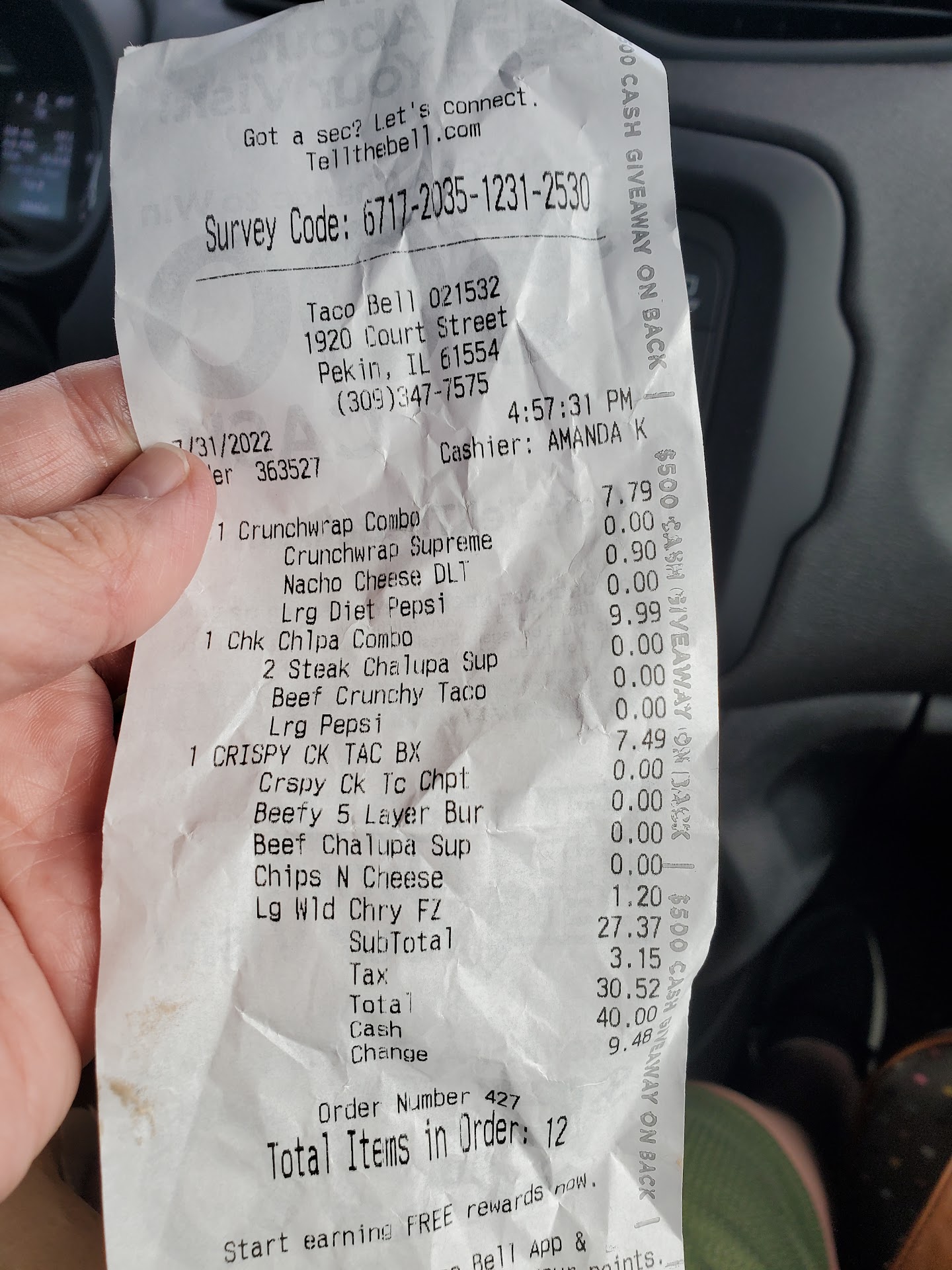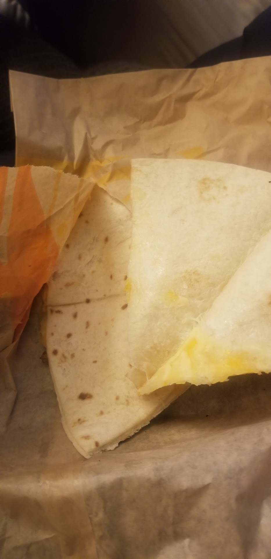 Ordered on their app after it not working for months. Got to the place not 10 minutes later only to be told they gave the order to some guy claiming the same name who had just left. They asked if it was an order for "John", no, under last name "Johnson", woman's first name. Kept asking if it was under a different name and then I read them the order number and they insisted they'd just made it. Definitely never using the app again because they freaked out my Mom who was afraid her credit card would be compromised, and it might be as we didn't get a clear answer how some random guy knew what name to give. And getting an app message over an hour later that the order was done? Did they not get it until after we had come in? Given that they checked the order number and claimed it was what walked out with the random guy, I really don't know. They remade the order. Since we were that we asked for the quesadillas to be double cooked, which they did NOT do, meaning they were barely toasted and warm, on top of them barely having any meat compared to what we'd had in the past. We tried the new cheesy steak burrito that's been in commercials, and while it didn't taste bad with no sauce or fiesta strips, it only had maybe 8 small pieces of steak and they were all on one end. The crunchy taco had more meat than any of the 3 quesadillas or the burrito.
