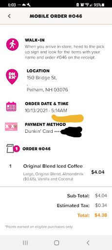 Pull up around 5:18am to grab a mobile order placed at 5:14 doors are locked. I see two workers inside but shrug it off and pull up behind the car sitting in the drive thru in front of the board that's glowing away completely on. After a few minutes this car leaves. Another few minutes the car behind me leaves. I get no voice over the box so I find the phone number to the store as I watch TWO associates running around. I am told on the phone they haven't gotten one Mobil order, I will not get my money back and they won't be open til 6, because the associate on the phone tells me she is the only one there and cannot make orders even in drive thru. I know there was two people so thats the first lie. The board is lit up and technically you open at 5 not six. So I do not believe they didn't get my mobile order they just refused to deal with me. So from 5:22 til "6" as she said when they will open I'm sure dunkins will make so much more of a profit while they steal people's mobile app money and refuse to make coffee or refund. Don't worry I won't be back. Not if you...