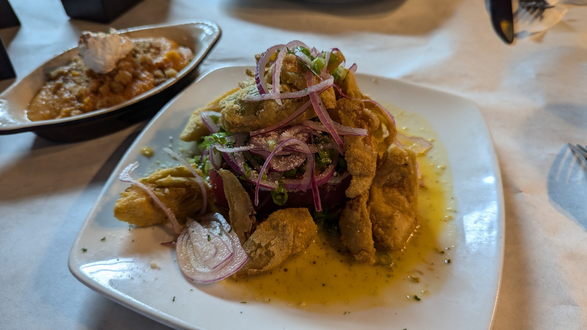 I chose the Tuna Esplanade. They prepared it to perfection (the way I asked for it). It was garnished with jalapeno lime hollandaise topped with fried artichoke hearts, red onions and Parmesan cheese. *Side note - I had never tried fried artichoke hearts and now I wonder where they have been my entire life. I am also not sure why this isn't an appetizer or regular side on anyone's menu.