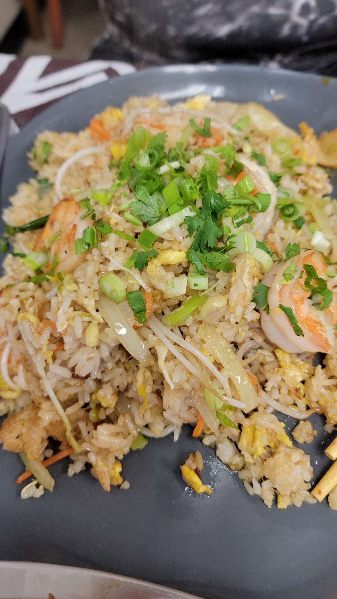 Loved that the carrot pieces were slivered, and not big chunks. Egg was chopped very fine and well scattered in the rice, green onions were delightful throughout. Good flavor, nicely done.