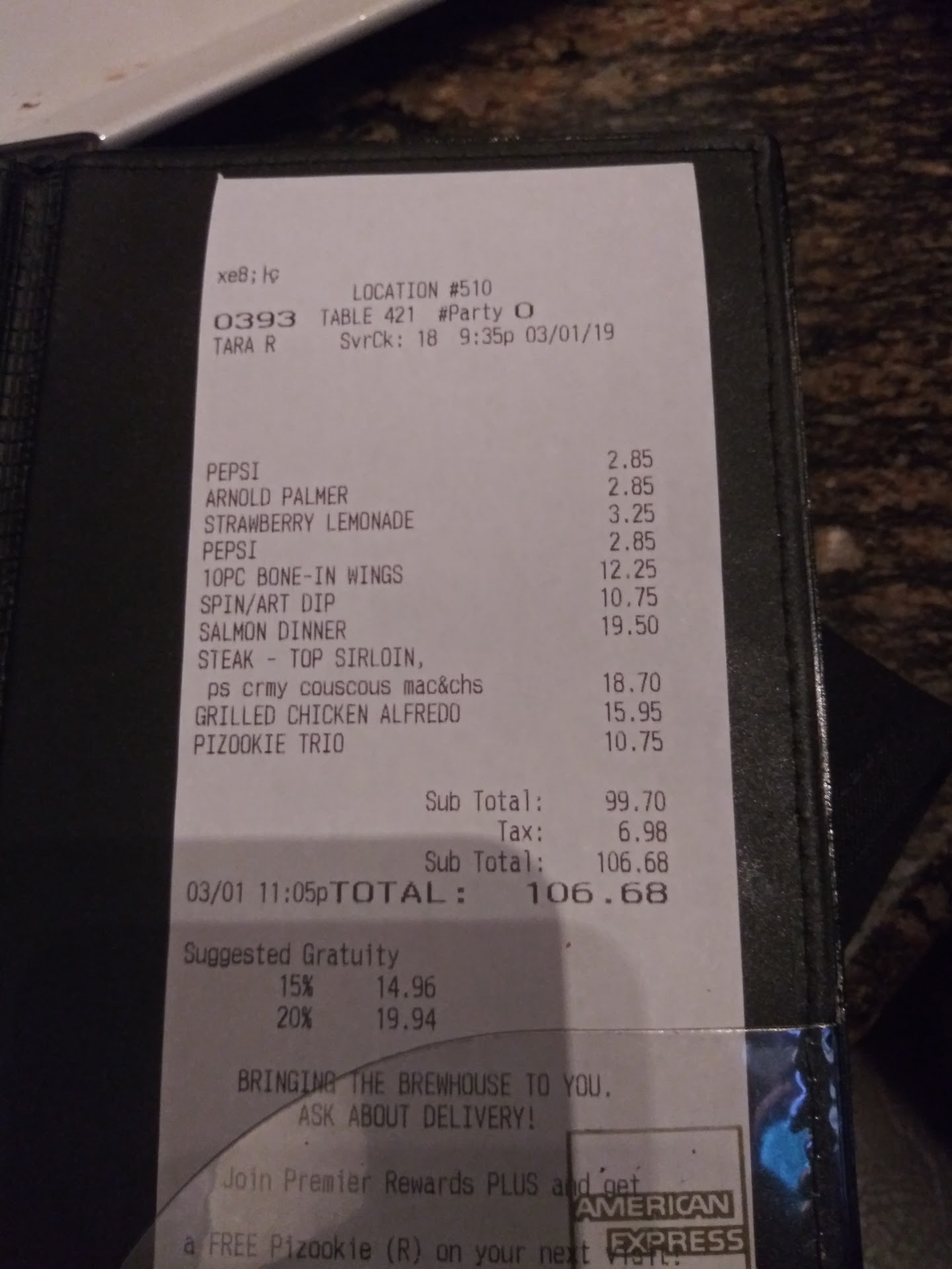 Ā Ā Ā Read moreOMG this place was great we went for my sister Kendra birthday dinner her picking. We had never been before but it was a great New spot. Tara was our waitress she knew her stuff was attentive friendly and overall had a great personality. She gave us the run down on anything we had questions about. The wait when we went was about 45-60 minutes we did go on a Friday night around 9pm. The atmosphere was great it is a family oriented place kid friendly. They have seating inside and out as well we sat inside. Kenny had the wings with the dry rub they gave extra rub on the side as well it was delish. He didn't want to share with us but the little piece I tasted was so good. So try the wings when you come. He apparently had the shrimp pasta and the sauce was fresh and it was a large portion. Kendra just had the spinach and artichoke dip and you could tell this was freshly made it was great as well my mom and I were just dipping and she took them away from us lol. Yeah they didn't want to share. Peggy my mom had the blackened salmon with mashed potatoes and broccoli. This was a change for her because no matter where we go she normally gets the same dish. But this time she tried something new. She said it was really good and she was excited about coming back to in different dishes. I had the 6oz steak with mashed potatoes and cous cous Mac and cheese. The steak was medium well and it was really tender my brother was stealing little pieces when I cut it up. The Mac and cheese was ok it had bacon and green onions it was a bit bland but the salt and pepper made it pretty good. Now for dessert we had the cookie trio. There cookies can were fresh baked with a scoop of ice cream we had 2 vanilla and one chocolate. We were trying to get at those they were super good. I would go back just for that.Over all 2 š will definitely be coming here again and bringing more friends. To management please make sure Tara gets a raise because she was...