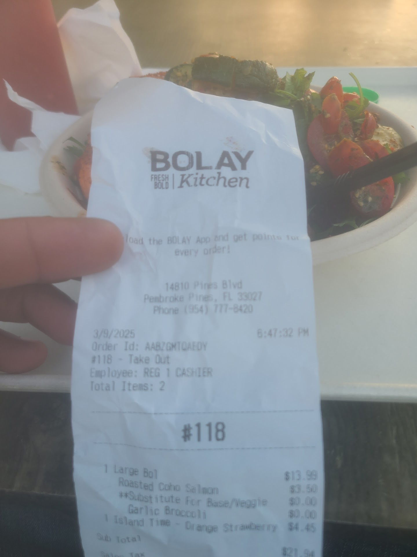 Read moreUsually, my experience is good at Bolay especially at the location on 441 near wellington and even the one on ockeechobee near the I-95. Unfortunately, the Pembroke at 14810 Pines dropped the ball on service. The REG 1 cashier who processed my order had just finished wiping down the glass and counters and proceeded to serve my food using the same gloves she had on from wiping, then was touching my food in the process and her personality was unfriendly which was disappointing. After I pointed out what she was doing and that I wasn't going to accept the plate she made, she had to change her gloves and rushed to make another plate.. Overall, it was my poorest experience at Bolay and I will not support this location anymore because it left me with a bad impression on the operations...