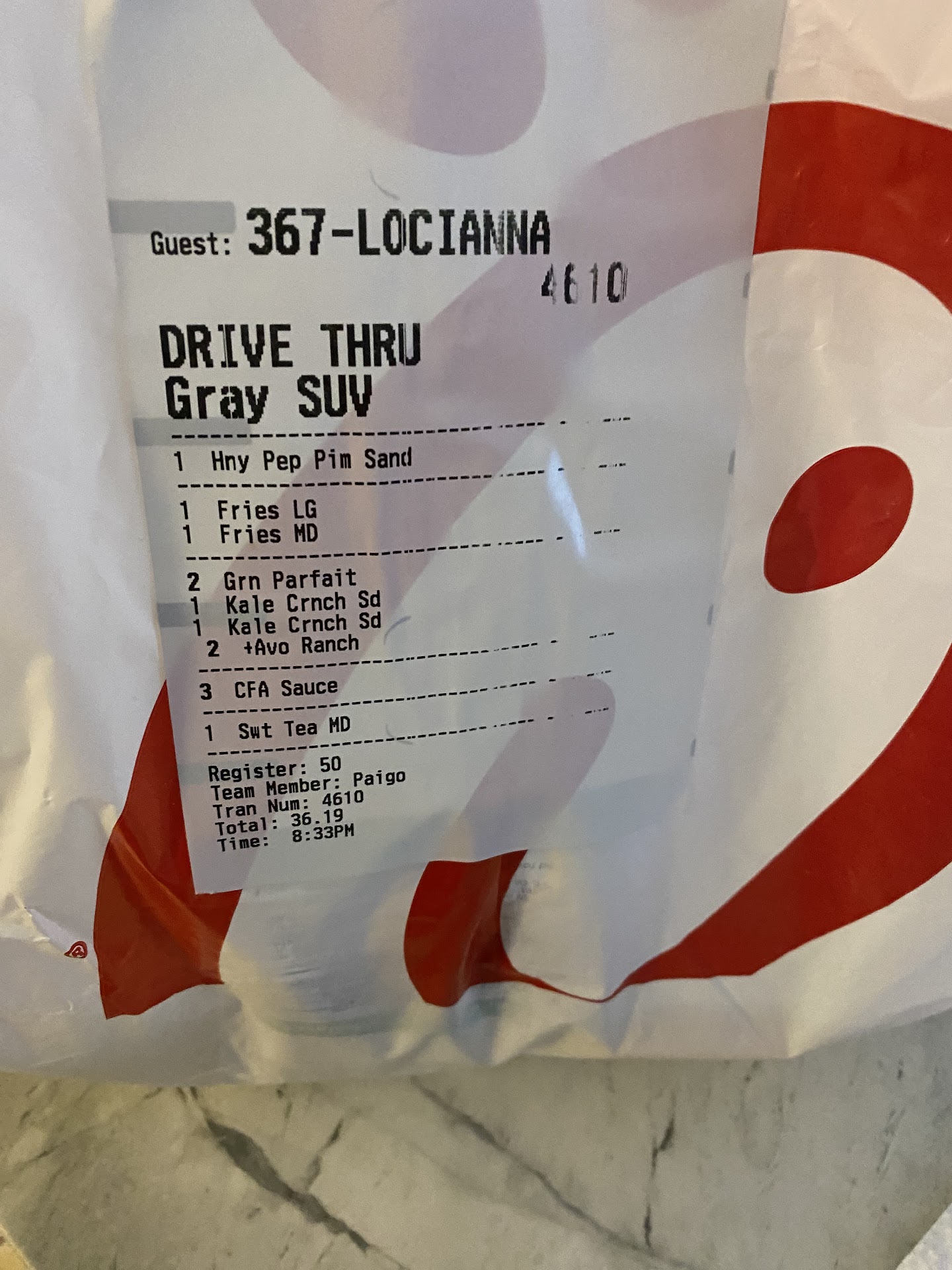 Literally just shy of 30 minutes from receiving that message that was food was on itās way out, a crew member walked out with my food. I didnāt think to check my food because this is chick fil a after all. We all saw the video of the lady praising them, right? I knew my food was good. To my surprise once I got home, my food was cold. My chicken tenders I didnāt care too much about luke warm, however my fries I had a huge problem with that. HUGE problem! We all know how cold fries are. Disgusting and soggy. Very disappointed.