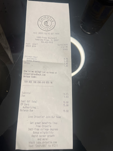 Read moreI've been going to this Chipotle since I was in high school. About 10 plus years, and I still go to this one. However, this past experience.I just had today makes me want to just take the extra drive to go down south to the one in Miramar. Because they has much better service. Normally it's decent. However, the past few times I've went. It seems like they've been skipping out on the protein. But at least the last time I went. The service was still pretty decent today. However, there was the family in front of me and understand that they had a complicated order. They're waiting for fresh chicken. And I didn't mind getting the older chicken. That was there so I pressed on and continued my order. Instead of forwarding with my order. I had to wait behind them until they're ordered finish, letting my food stay out and getting cold and then apparently that people behind me we're able to skip in front of me and then they eventually move them back so there's people shoveling in front of me behind me and I feel. Like I wasn't getting the proper attention. While I was making my order. And then when it was finally time for me to pay. They go back in line in order to process everybody else's order, so I'm waiting at the register with my food sealed by the time they came back in order to let me pay for my order. I felt like I was being rushed at this point. So not only did I not get the proper attention. While my food was being prepared, but now I'm being rushed out. Makes no sense and I didn't get a receipt. Luckily, I scanned my phone beforehand, and I eventually got my points. It didn't automatically show app, so I wasn't even sure if I was gonna get my reward points overall terrible service when being given. No attention and being rushed out. When the people before me were getting a lot of attention and were being catered too as well as the people behind. Maybe they just took one look at me and it was just like he wasn't...