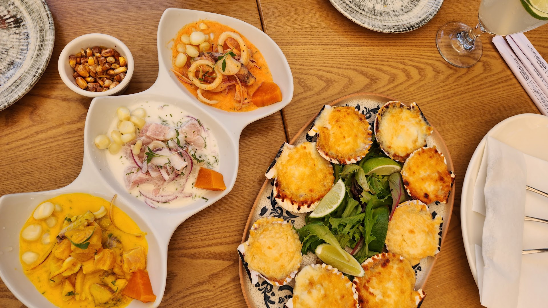 For appetizers: • Piqueo 3 Ceviche’s Mixto was delicious! The leche de Tigre one was perfect! All 3 were very good though. • Pulpo Anticuchero was perfect grilled and the anticuchera sauce on top was divine! Toda una delicia! • Conchitas a la Parmesana were my favorite every time I visit this restaurant! • Conchitas con mantequilla and herb were nothing out of this world.