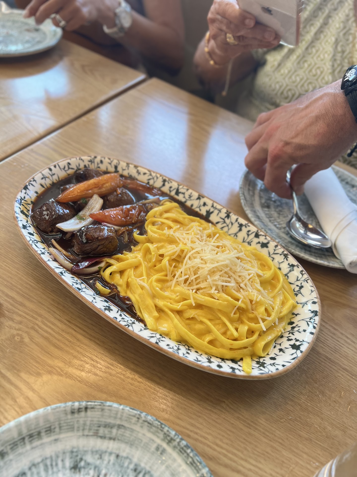 For entrée: • Pargo Frito which was accompanied with Fried Yucca. Perfectly fried and tender on the inside. Yucca’s were delicious with your side green sauce. Huge fish too! • Fettuccine a la Huancaína with Lomo Saltado. First time anywhere in their locations steak was cooked perfectly medium. Huancaína sauce needs a little work as it tasted just like a Mac and cheese.