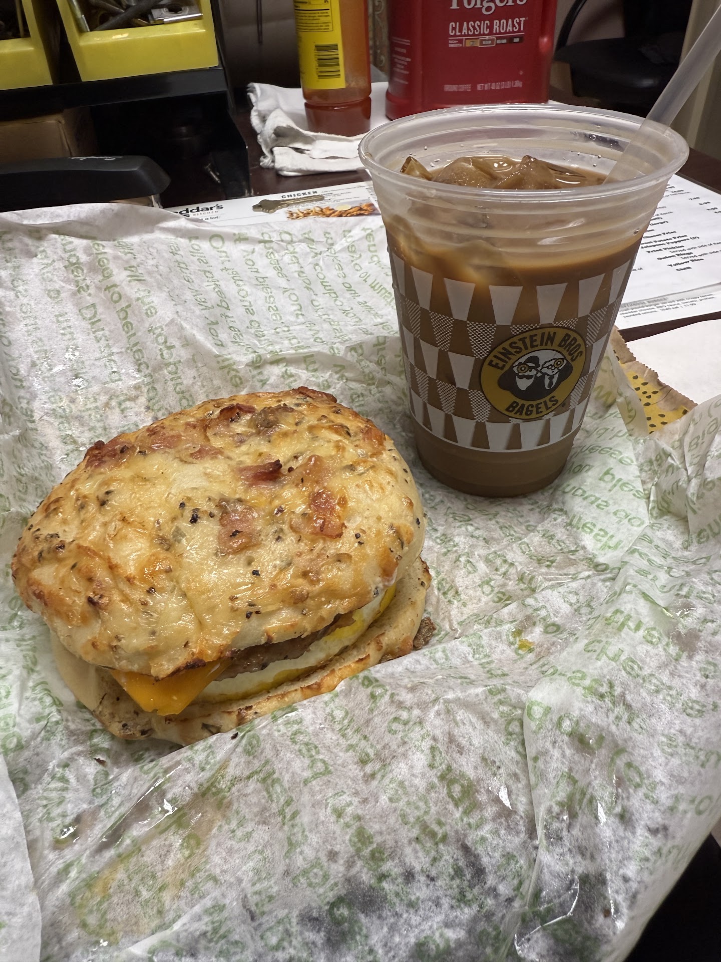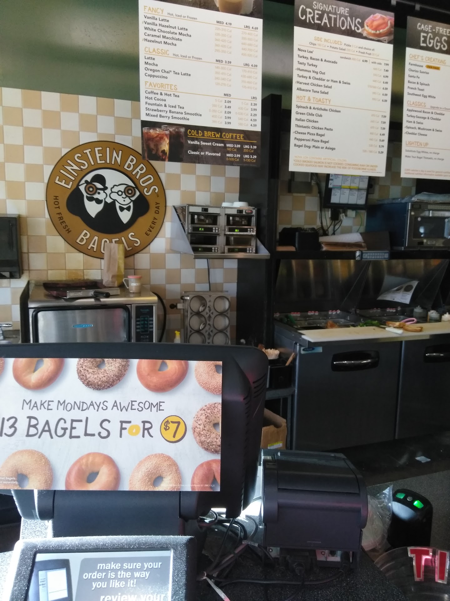 DON'T GO HERE...Been going here for years(7), Well I used to and will switch back to another location again after this last experience, This one Frankly SUX BAD!. 2 weeks in a row the coffee was out at 12 noon asking why? and if? gets you an EYE roll worthy of this review. The employees here hate their jobs obviously or are not trained or being paid enough however I doubt it's the latter, they can't follow basic requests like "lightly toasted" or "cutting it in Half", The bagels are good at Einstein but the lack of supervision and moving with intent as well as dirty tables terrible attitudes and they act like they're doing you a favor. why? by expecting them to do their job, whatever that is. It was like a Chinese fire drill of chaos behind the counter. In most locations the cashier is one not musical chairs of three, I watched and waited and ate my whole bagel before the coffee was even ready and only one kind with 4 canisters just sitting there in disarray. it would have been NONE had I not told them They were on their phones, looking at the clock not giving a mind to even other elderly couples coming in and leaving without ordering because of the clown show on display. It's a Sunday each time and I'll drive 8 miles away to go to a better location this one is a dead man-walking store IMO. The owner needs to show up unannounced and see what I'm saying, no reason for this at all it's a great location to have, but like the hit show The Profit say's " The People, the Process, and the Product" make a good successful business this sorry place fails 2 of the 3. I would love to see how the profits on this location have Tanked I'm betting over the last year or 6-8 months. Now you know why. good...