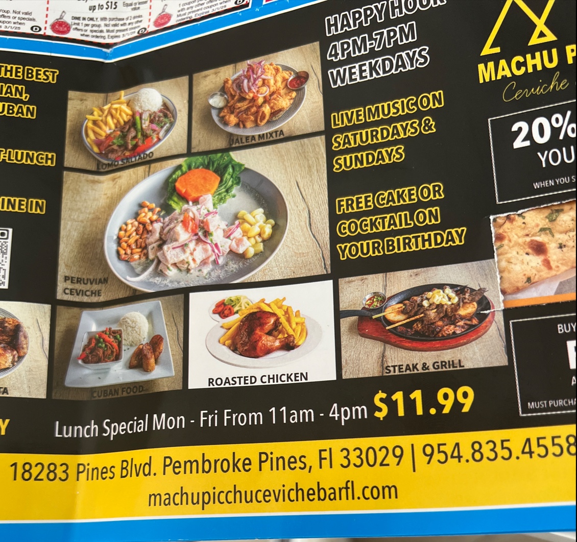 Feedback from others I was with: the arroz con pollo was very greasy and had a unique taste that made it taste odd. (I tried it). The chicken was dry and lacked flavor.