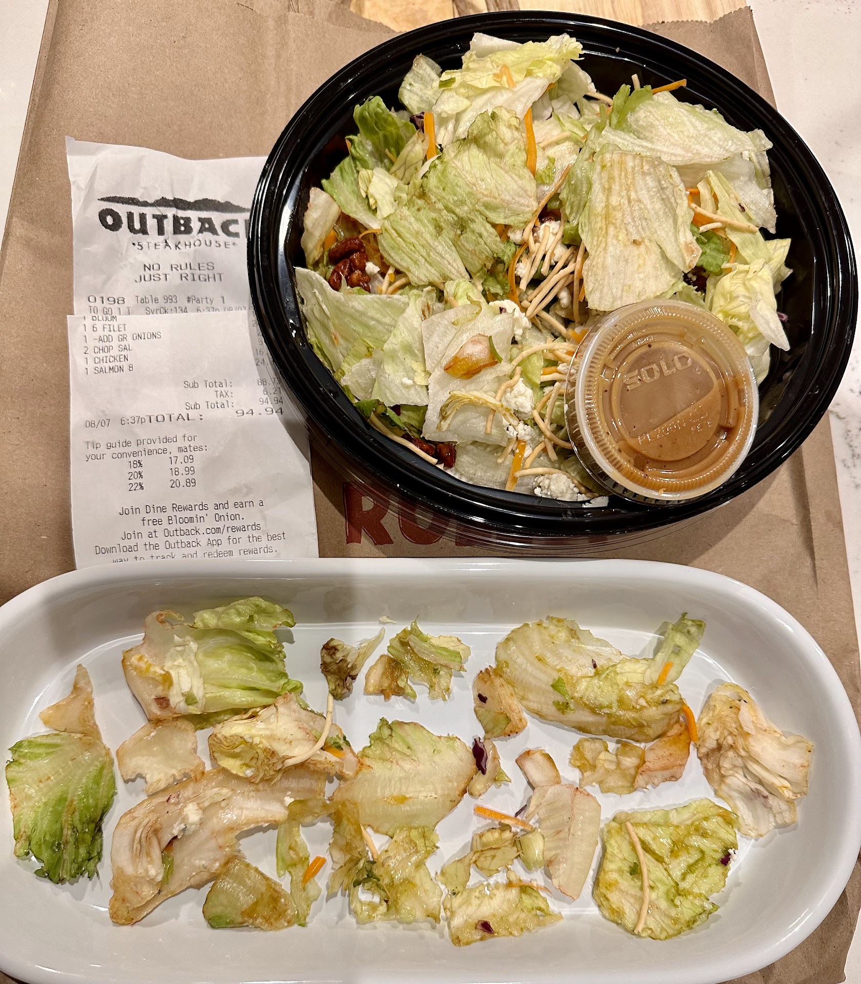 I’d taken a few bites of my salad before I realized that some of the Iceberg lettuce was partially rotten. After closer examination I realized that the lettuce was so slimy it looked bacteria laden. 🥲 (See attached note about decaying Iceberg & Listeria Food-borne illness… So SAD because the daily, hand-chopped salad here used to be very delectable.)