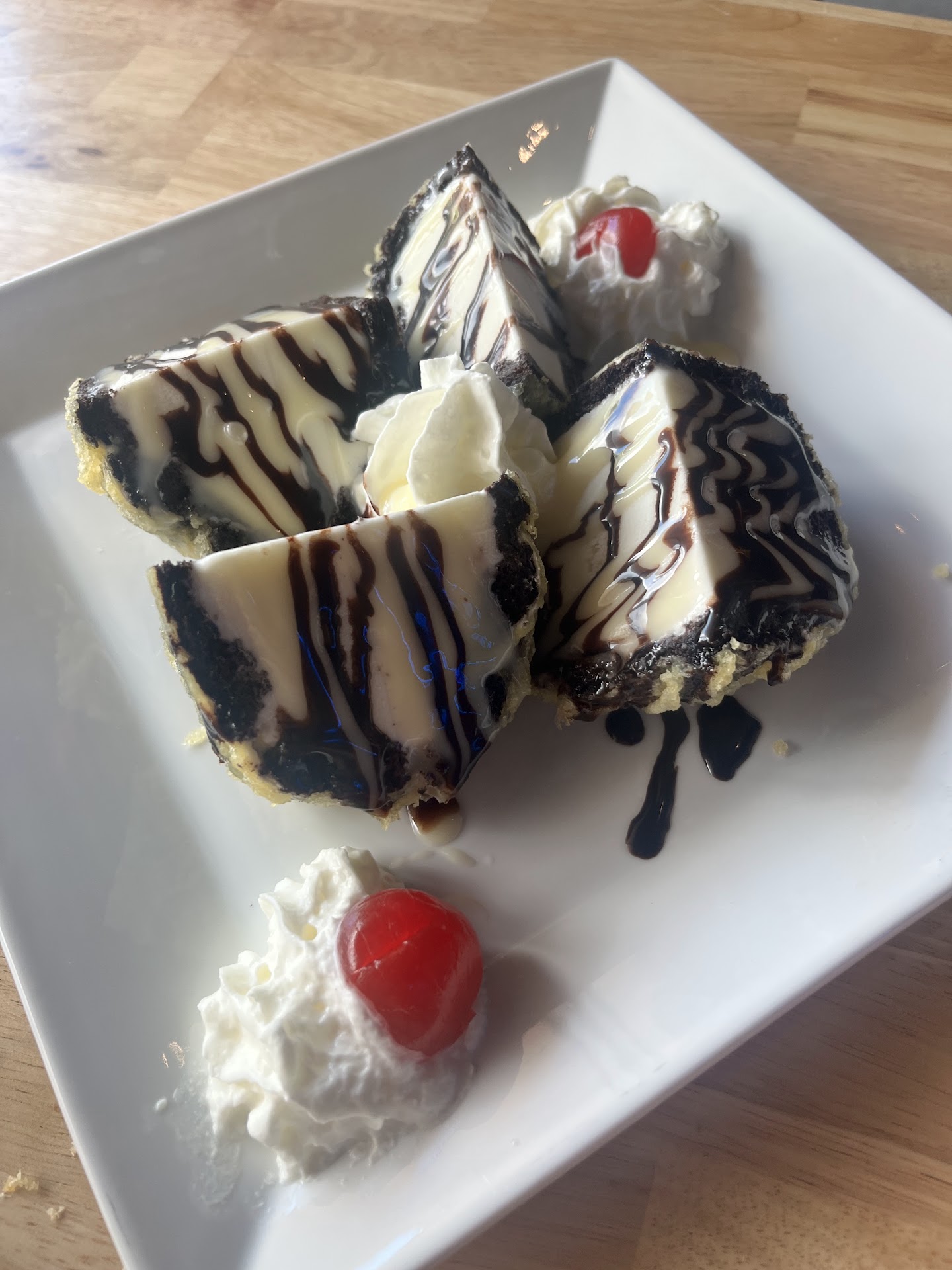 The sweet denouement to this culinary symphony was the "Fried Cheesecake," a dessert of unparalleled excellence. Its ethereal texture, complemented by the delightful crunch of fried dough and the judicious drizzle of chocolate, rendered it a sublime conclusion to our gastronomic journey.