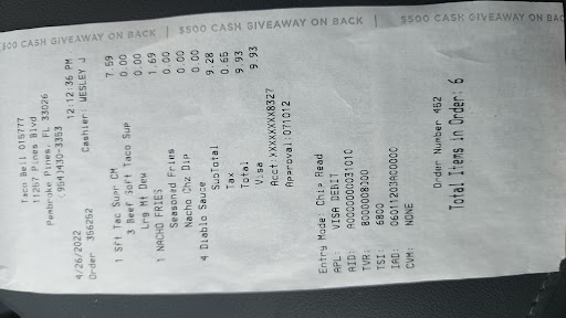 Ā Ā Ā Read moreMy husband & I wanted to try the new Big Cheez-It Crunchwrap Supreme that Taco Bell just recently premiered. I ordered separately from him, just in case they got our orders wrong, it would be easier to try to fix 2 separate orders, rather than one large one. And just as expected, everything was wrong. We ordered ahead via the app for in-store pickup. It was empty inside of the store & our orders werenāt ready well past the promised pick up time. There was one person ahead of us. On the customer pickup tray, they placed down a sealed bag with no name on it. We asked the workers what the name was on it, & they just shrugged their shoulders and went back to doing whatever they were doing. They then bring out my husbandās order with 4 items missing, & NO cups for the drinks that he purchased. At this point, Iām still standing & waiting for my order to come out. I waited an extra 20 min until I decided to open the ānameless bagā on the pickup tray. It was my order!!!! I cannot express the level of anger that I chose to suppress at that moment. So when we get home about 15 min later, my husband bites into his ācheez-it Crunchwrapā, only to find out that they gave him a regular old Crunchwrap. He was livid! Imagine that you go through all of that, just to pay for something that you didnāt even receive. This was beyond unacceptable! ANYONE READING THISā-do not order from this location. I havenāt even expressed how unsanitary & completely disgusting this place is! This place is not cleaned on a regular basis. The front counter looks like it gets wiped down with dirty mop water. This is a 0 out of 5 stars establishment. Beware, & Donāt let...